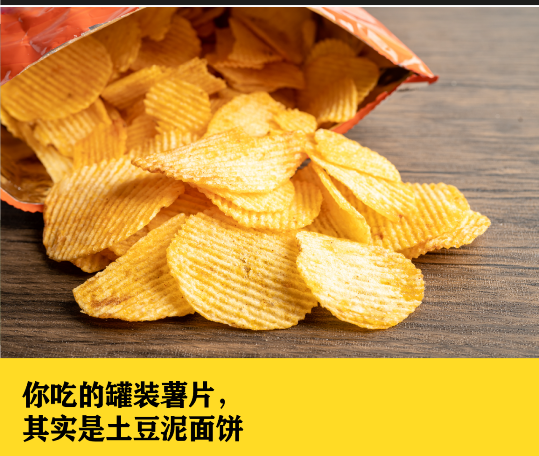 但不管是颗粒全粉还是雪花全粉,严格意义上来说,我们吃到的罐装薯片,都只是一种经过油炸与混合的“土豆泥面团”。