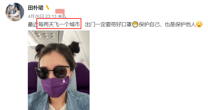此外,田朴珺还晒过自己在飞机上的照片,表示自己每两天飞一个城市。通过这些动态,可以看出她的生活非常忙碌。