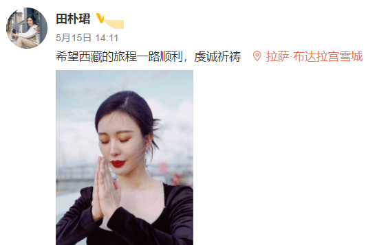 可以看出,田朴珺的生活和工作都非常精致。5月15日,田朴珺还在社交平台上晒出美照,并表示自己在外面旅游,希望一切顺利。照片中的田朴珺双手合十姿势虔诚,一抹红唇显得整个人特别美颜。