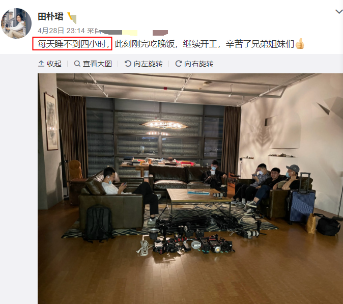 4月末的时候,田朴珺还发文表示自己每天睡不到四小时。通过田朴珺晒出来的照片可以看出她的房间堆满了设备和仪器,各种镜头和脚架一应俱全,一屋子工作人员也已经整装待发。