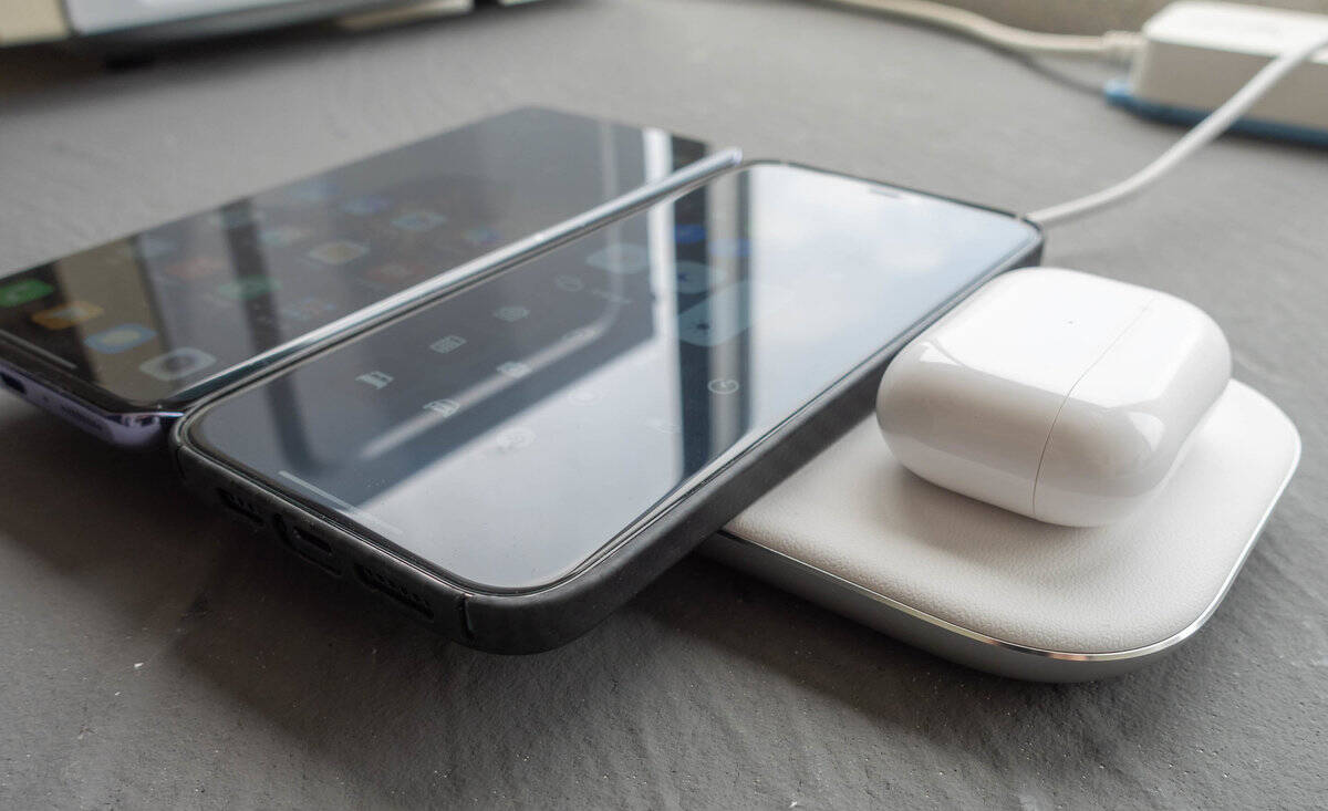 官方表示这款设备最多可以同时为三款产品进行充电,所以这里我们就选择了小米 11 Pro、iPhone 12 Pro 以及 AirPods Pro。可以看到三台设备虽然已经占满了整个充电板的面积,但是依然可以同时进行充电。