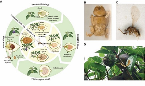 薜荔及其传粉榕小蜂的生活史(A);雄性薜荔榕小蜂(无翅,身体结构特化,终身在隐头花序中生活)(B);雌性薜荔榕小蜂(C);雌性薜荔榕小蜂聚集于薜荔隐头花序外侧,准备进入花序传粉/产卵(D)。