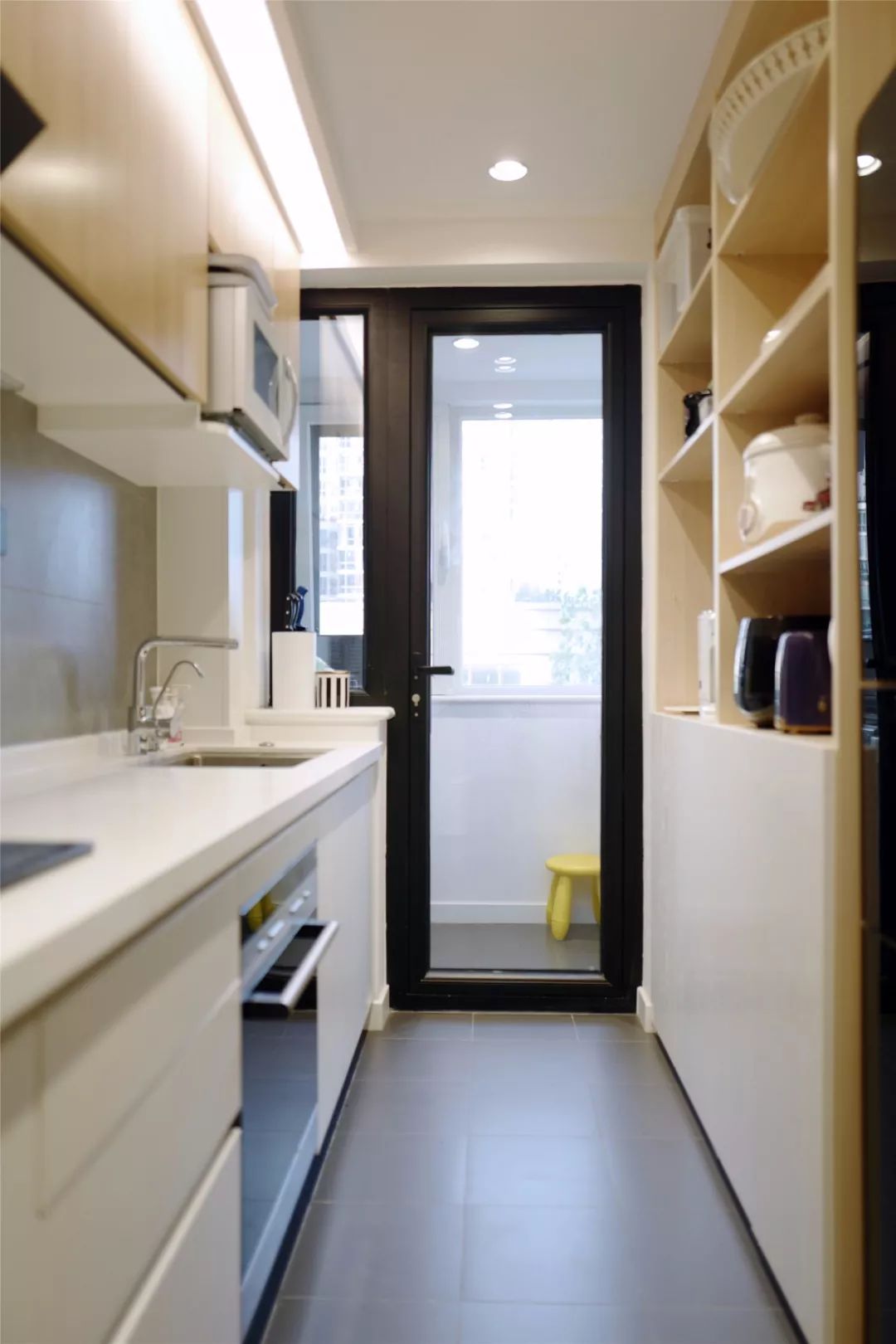 生活阳台就放在了厨房的外面,所以厨房做了一字型的布局,在橱柜的对面还做了嵌入式的柜子,让厨房储物空间变得更为充足。