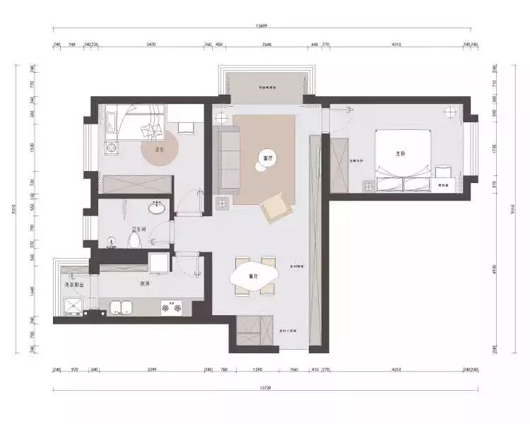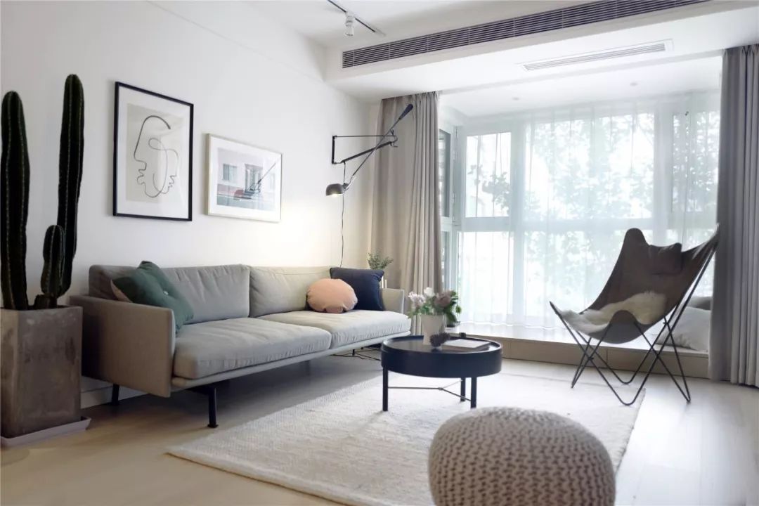 客厅的沙发墙选择了留白加上挂画的设计,浅灰色的布艺沙发和绿植、地毯给人一种舒适感,客厅外的阳台改成了一个地台,增添休闲性。