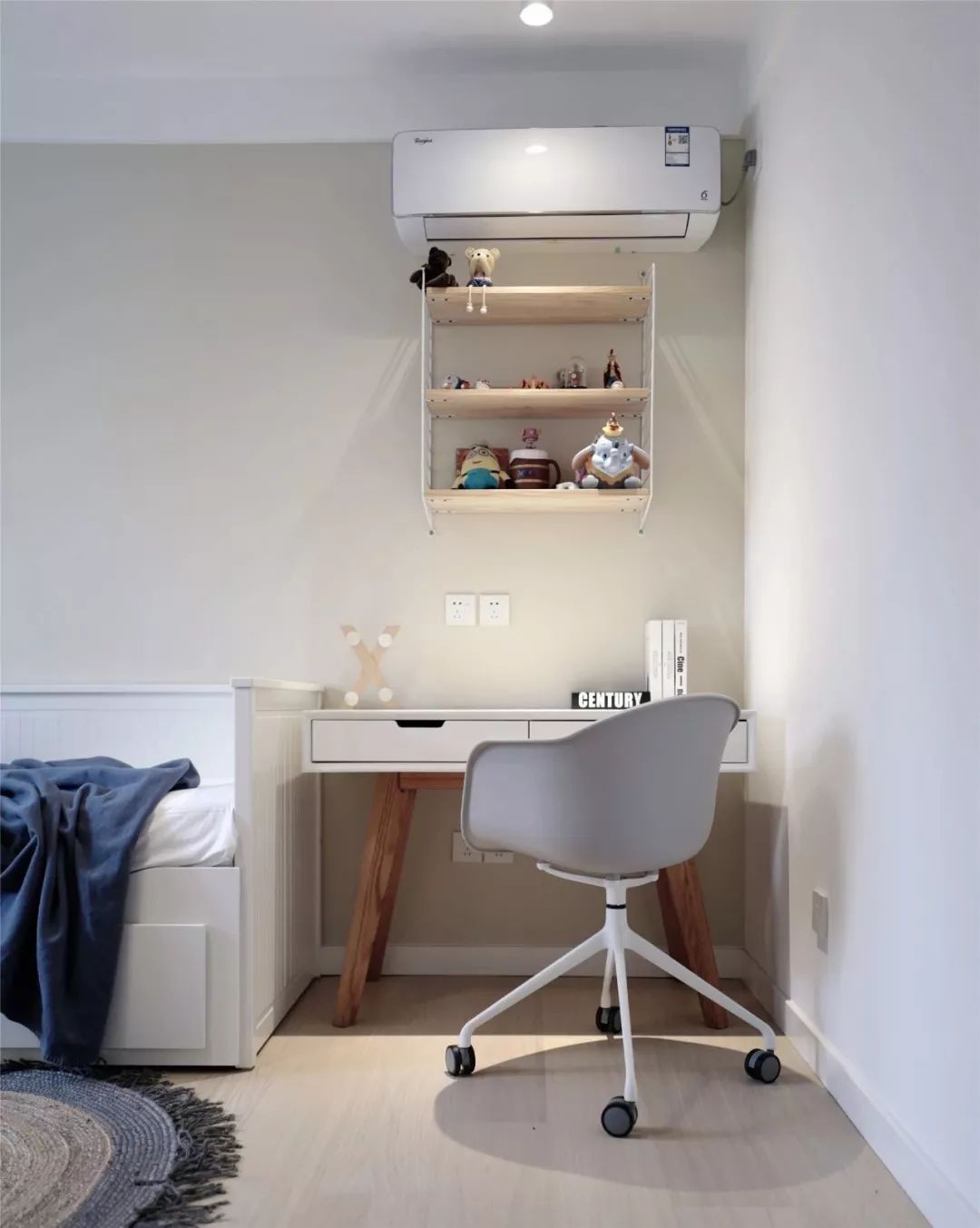 沙发床的边上则是摆放小书桌,墙面做置物架来摆放设计,整个空间不大,但也能满足睡眠、工作和收纳的需求。