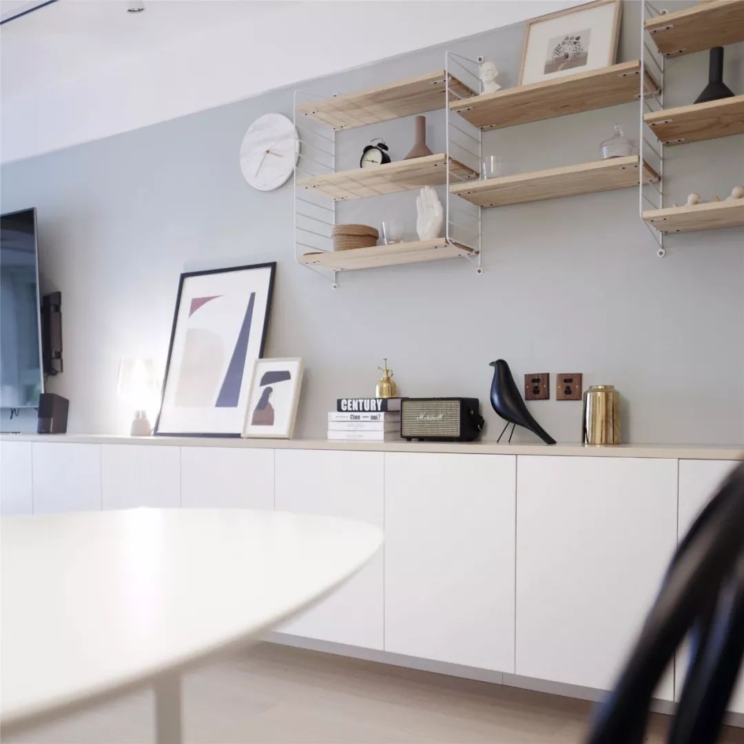 柜子延伸到了客厅就成为了电视柜,墙面刷成了浅灰色,和白色的柜子形成对比,让整个空间变的更有层次感一些,矮柜上方摆放的装饰画、装饰品也提升了整体颜值。