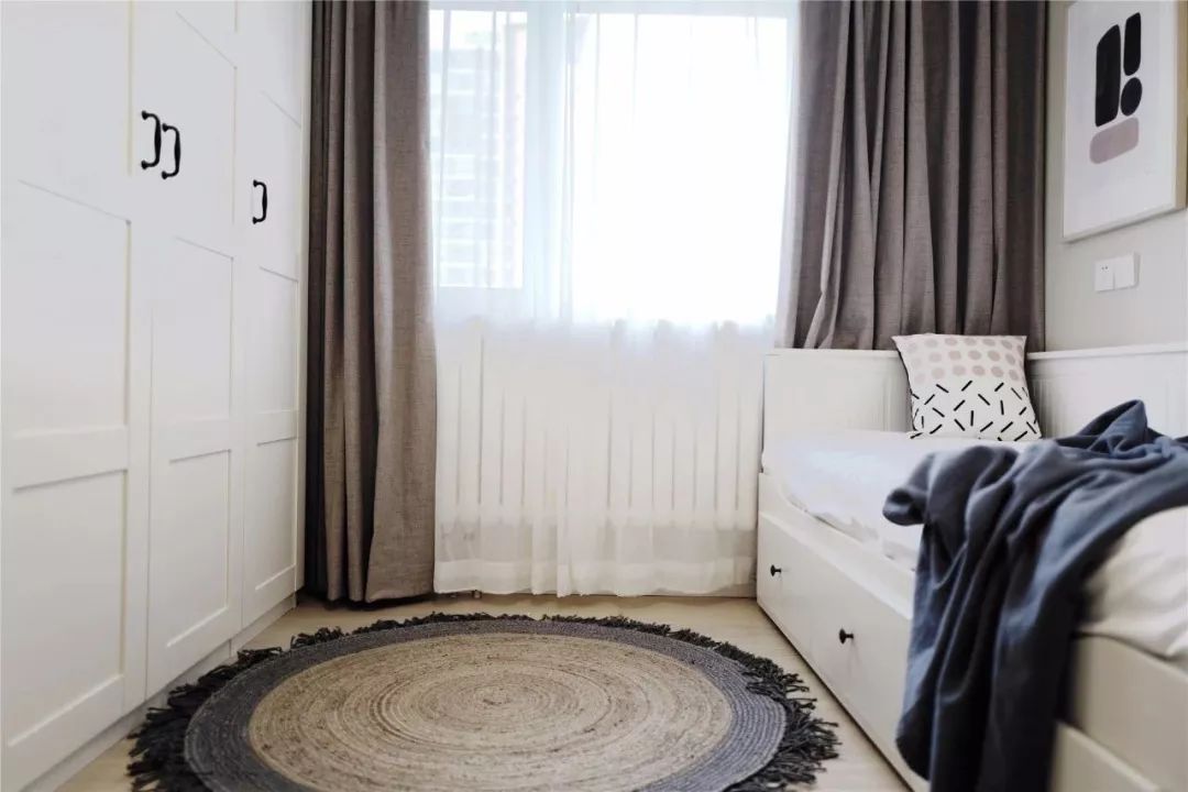 次卧则是在一侧做上了到顶的衣柜,另一侧摆放一个沙发床,中间这个创意的地毯给素雅的空间增添了一些设计感。
