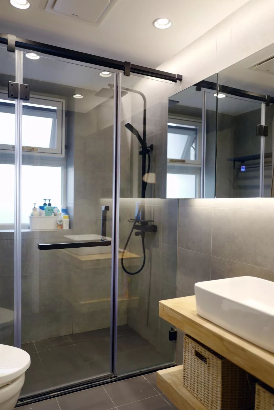 卫生间内部做了干湿分离的设计,淋浴房、马桶和洗手台成三角形的布局,洗手台上方大面积的镜柜让卫生间看起来更加宽敞。