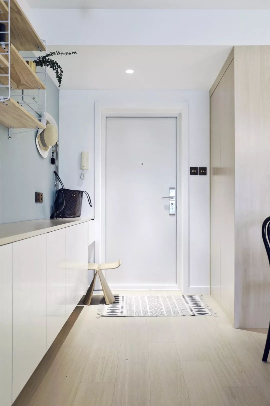 入户的玄关走廊一侧做了悬空的矮柜,一直延伸到客厅处,上方选择留空做置物架、挂衣钩等,让空间不会那么局促,又能满足收纳和装饰的需求。