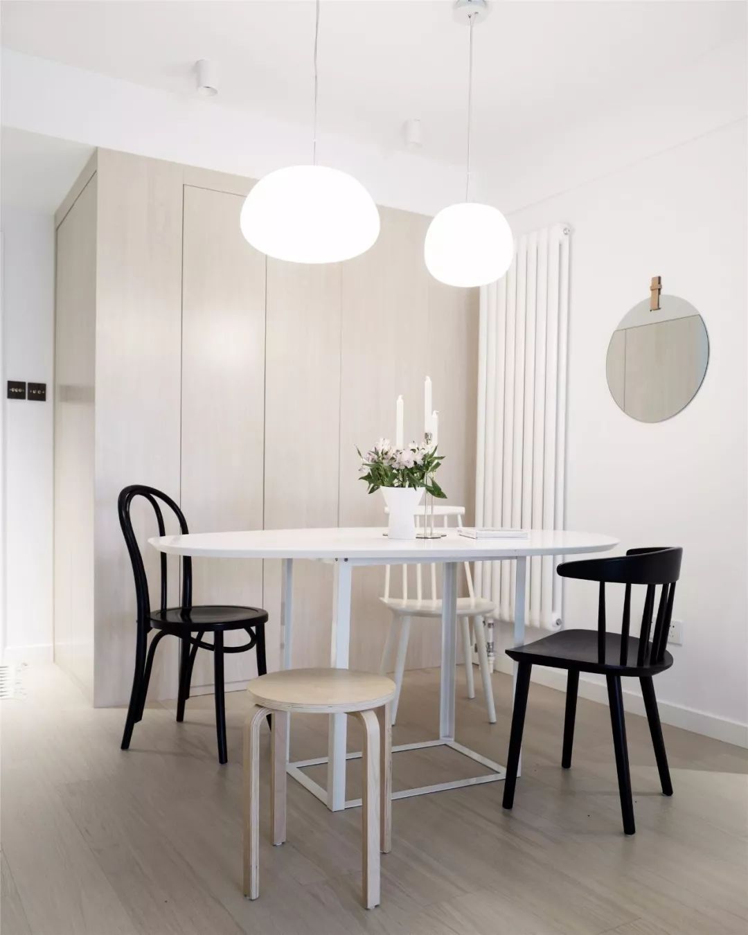 在玄关走廊的另一侧是做了嵌入式的木质柜子,隐形式的柜门更显趣味性。简单的餐桌椅和镜子、暖气管结合起来,给人一种简约感。