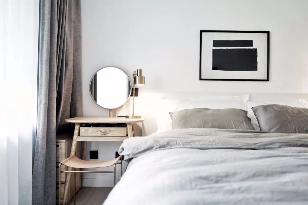 主卧室的选择了白墙搭配灰色调软装的设计,营造出轻松感。用一个梳妆台来代替床头柜,让日常使用变得更为方便。