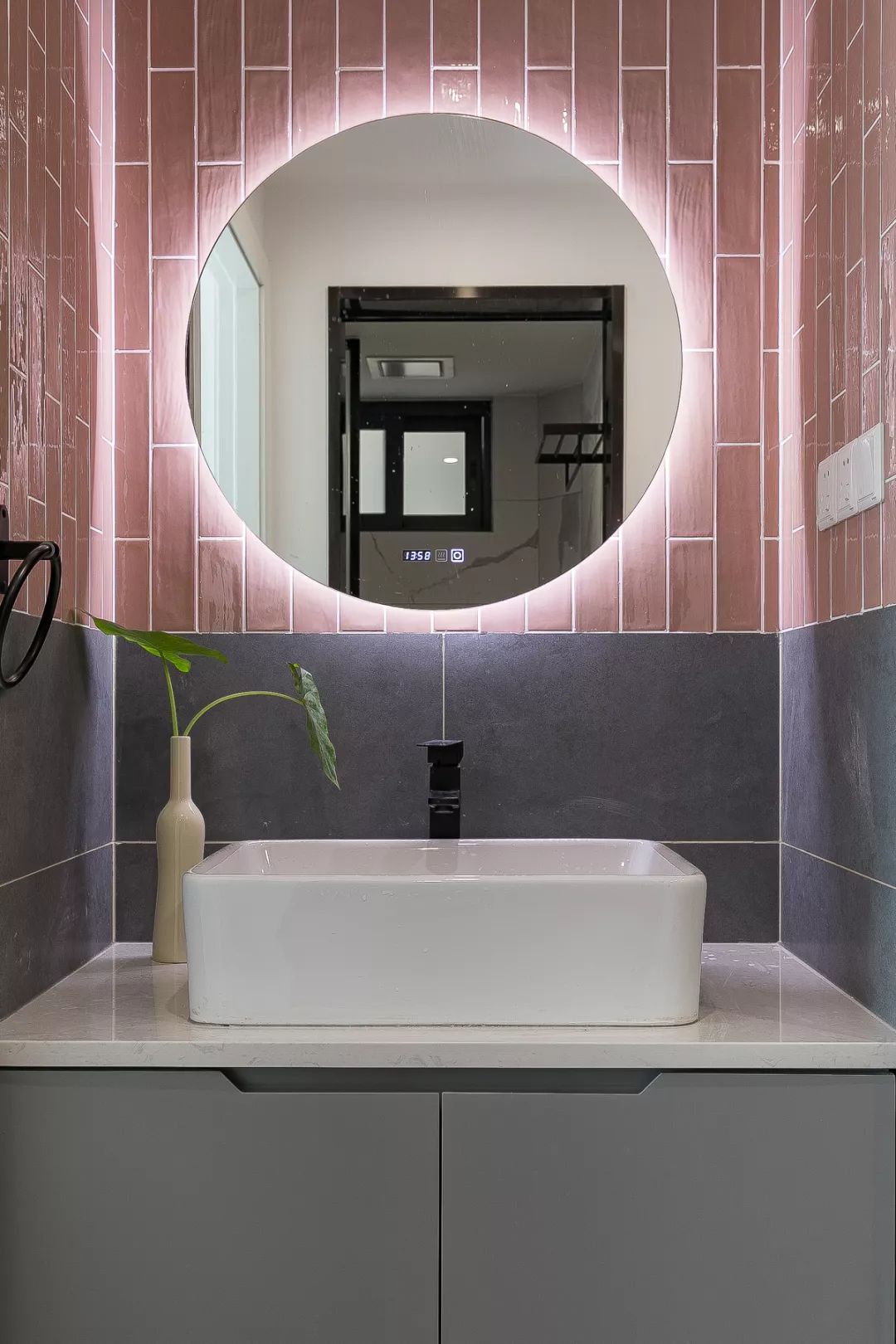 卫生间选择了把洗手台给放在门外,这样平时使用会方便一些。粉色的墙砖和灰色的墙砖结合,圆镜加入了背光的设计,看起来层次分明。