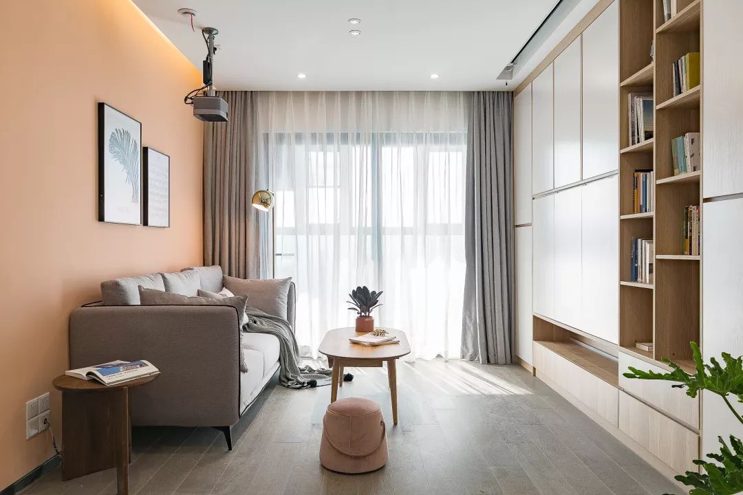 客厅处选择了舍弃电视的设计,把电视背景墙做成储物柜、书架,隐藏式的投影幕布满足观影需求。同样是橘黄色的墙面,在吊顶边缘留出藏光的设计,看起来更为时尚。