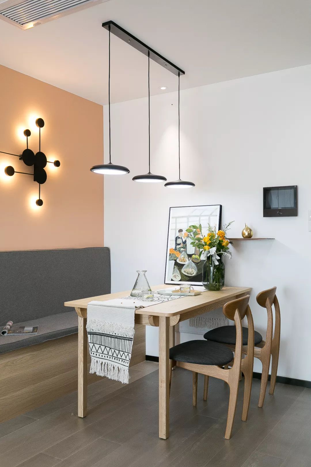 在入户门的另一侧就是餐厅空间,卡座式的餐厅设计轻便又实用,橘黄色和白色的墙面交替,创意的吊灯和壁灯结合,让餐厅看起来很有格调感。