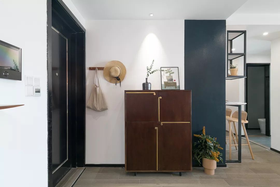 入户没有玄关走廊的户型,设计师选择在入户门的侧方墙面做挂衣钩、摆放一个斗柜来方便日常使用,斗柜上的门把手非常有设计感。