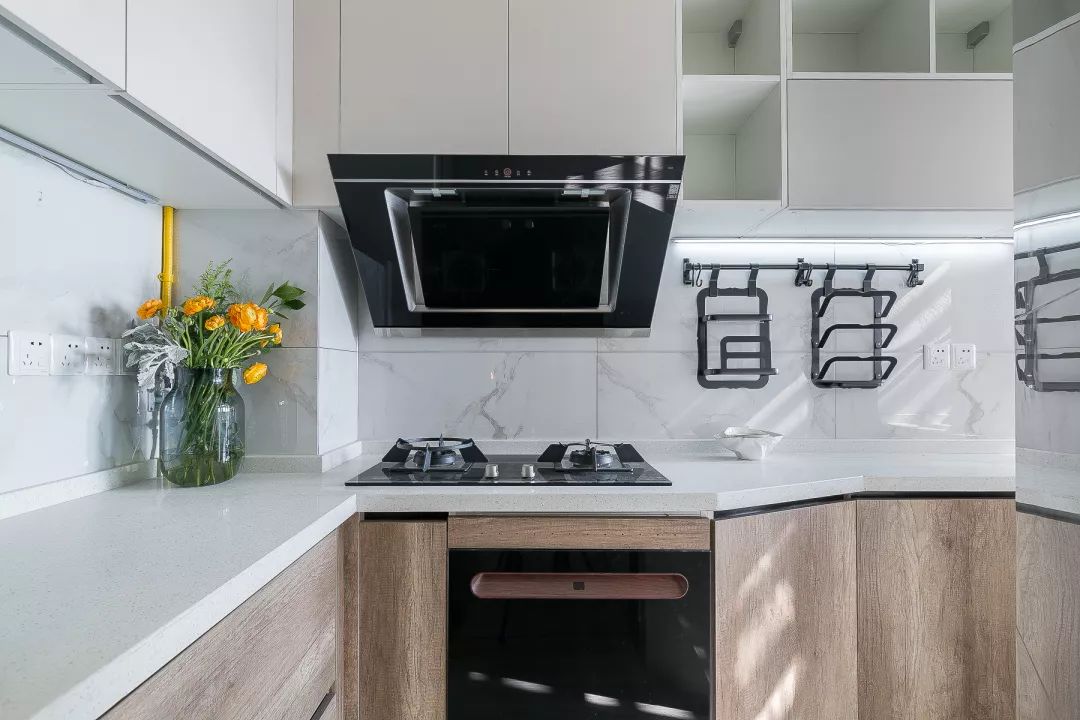 厨房内部的橱柜根据厨房的格局做了异型的处理,大理石的墙砖搭配木质的柜门,整个厨房看起来简约自然而又宽敞明亮。