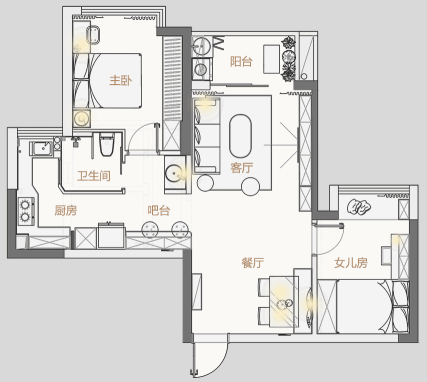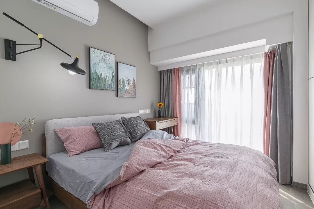 主卧室的床头背景墙刷成了灰色,在窗帘和床品上加入了粉色作为点缀,让卧室更加优雅。一侧床头柜被梳妆台所代替,更利于日常使用。