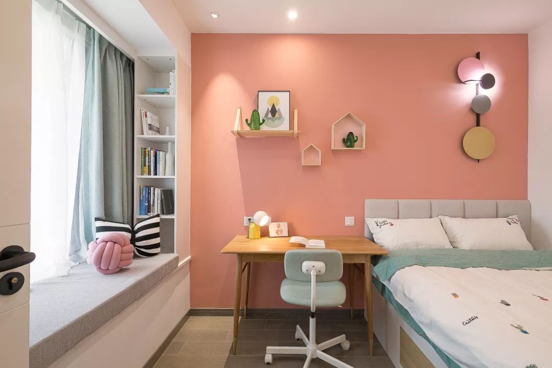 儿童房的墙面是选择了更为浪漫、可爱的橘粉色,用隐藏的筒灯和壁灯来代替主灯,看起来更为简洁。书桌靠着床摆放,方便孩子平时学习。