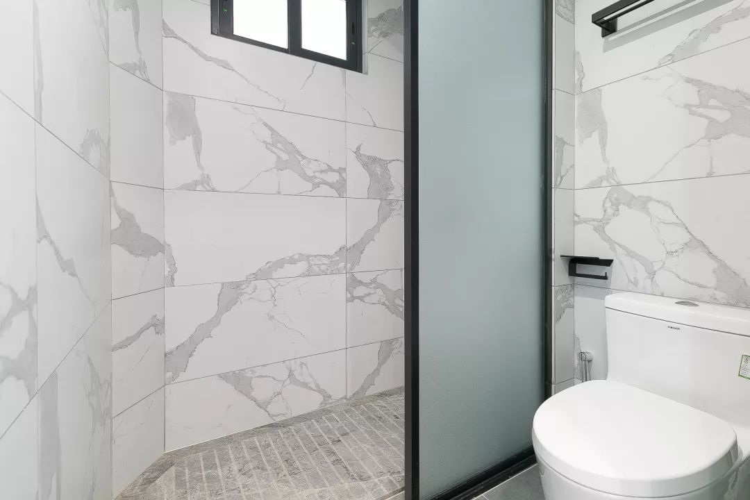 卫生间内部的墙面铺贴了白色的大理石瓷砖,淋浴区和马桶之间加上了磨砂的玻璃门作为隔断,整个空间看起来明亮而又宽敞。