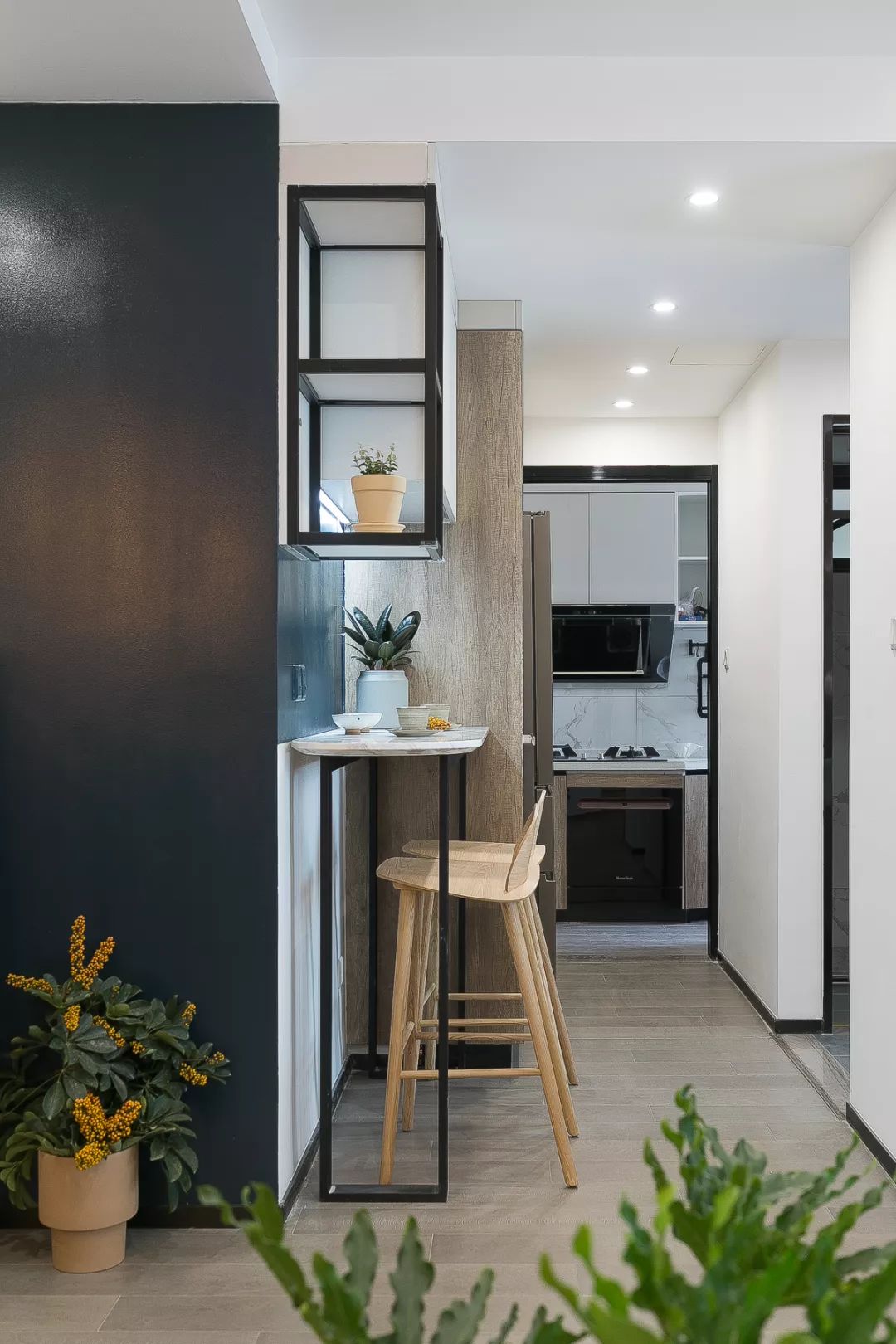 通往厨房的走廊过道也被充分利用了起来,一个迷你的吧台和置物架、黑板墙结合,显得很有文艺范。吧台边上做上柜子,也把冰箱给嵌入了柜子当中。