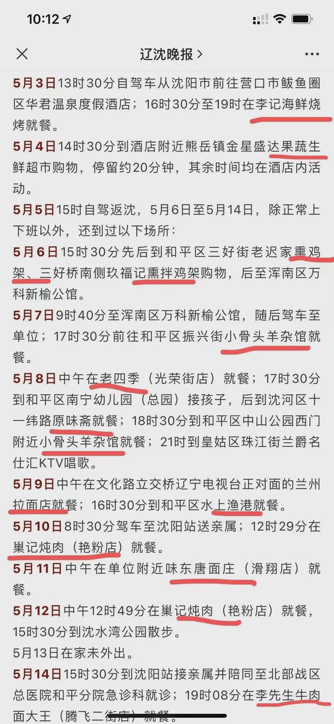 根据流调显示,这位沈阳大爷退休,因能力优秀被医院返聘,但是业余生活丰富,五一假期期间去鲅鱼圈自驾游,回到沈阳后,天天下馆子,鸡架、炖肉、抻面一个不落,每天还不重样。晚上21:00还会去KTV唱歌……