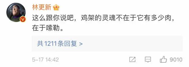 坐拥5400多万粉丝的沈阳籍明星林更新说,鸡架的灵魂不在于他有多少肉,在于嗦勒。