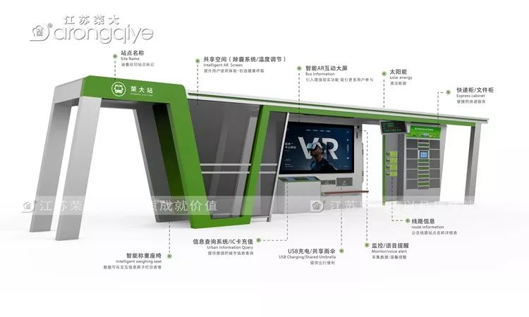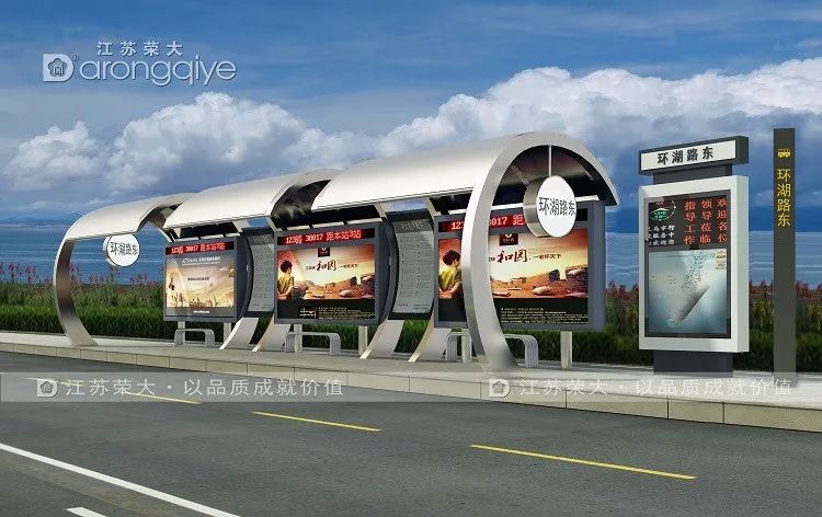 江苏荣大智能公交站台,它再不只是传统的公交车站台,为了让乘客等车不再无聊,江苏荣大生产出的“人性化”智能公交候车亭,让乘客可以通过电子屏幕查看公交实时运行状态和站点、线路、换乘信息,查询周边景点票务信息以及天气预报、生活服务、地图导航信息。此外,加装的LED灯显著提升站亭内的亮度,站亭顶部安装的光伏板可以为公交站亭提供绿色能源。公交站还将借助第三方平台,提供手机充电、快递柜等服务。