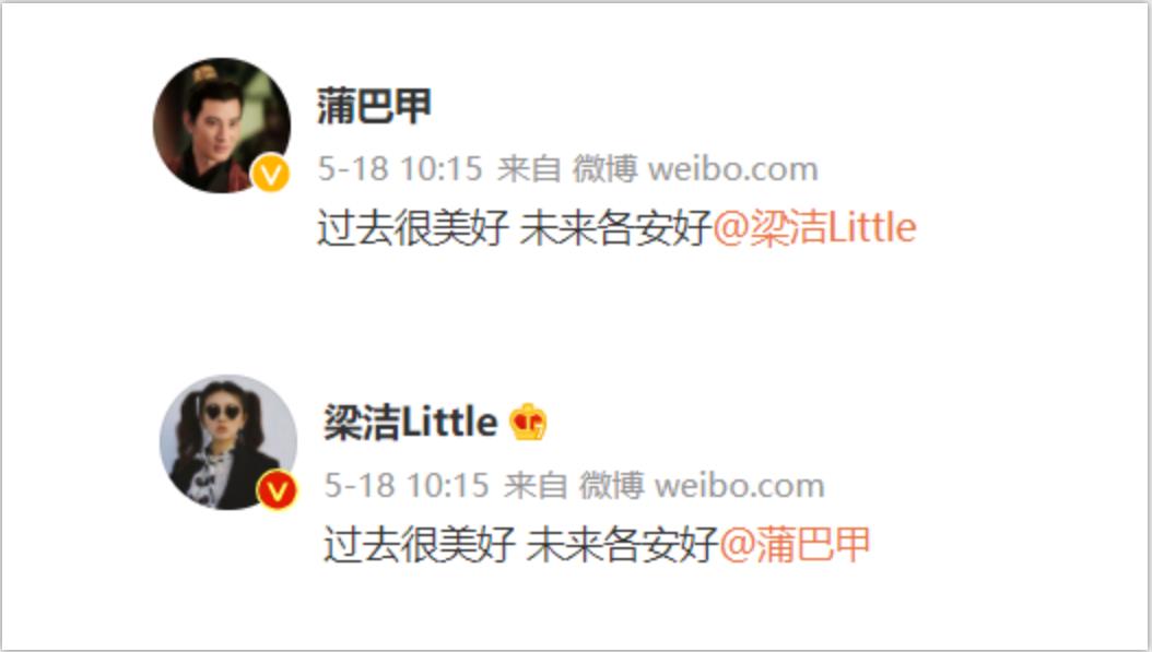 梁洁工作室发布的文字几乎与蒲巴甲工作室所发布的如出一辙,只是将“蒲巴甲先生与梁洁女士”改为“梁洁女士与蒲巴甲先生”而已。由此可见,双方工作室应该是商量好了的文字。而双方工作室发布的时间都是10:10。五分钟后,蒲巴甲和梁洁也在同时间分别发出完全一样文字的微博:“过去很美好,未来各安好”。
