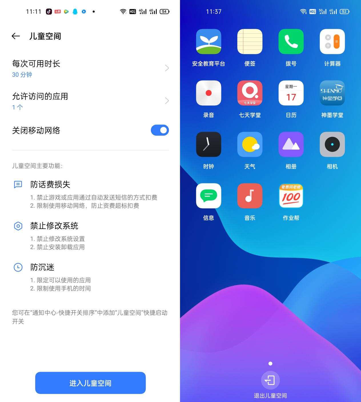 还有这个儿童空间也是我喜欢的,毕竟家有上学小孩,很多作业,资料什么的需要用到手机,家长一直在边上陪伴是不可能的,所以开启儿童空间,将孩子需要使用到的应用放到儿童空间,这样也比较放心一点。儿童空间可以关闭网络,可以进行使用时长的设置,可以添加需要的应用,在儿童空间中,除了打开添加的应用,孩子是无法进行任何操作,并且退出时需要管理员密码,前提是你孩子并不知道你的锁屏密码!