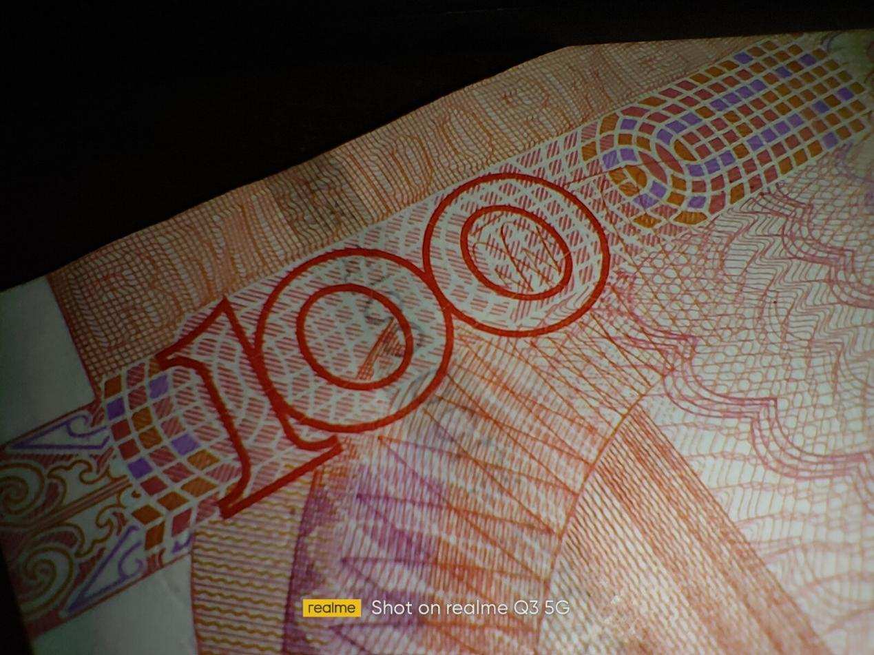 realme 真我Q3支持最短4厘米的超级微距拍摄,试了试拍摄百元大钞,线条纹路以及隐藏的100元数字都表现清晰,不过我个人并不喜欢超级微距拍摄,更喜欢通过标准模式的变焦来达到拍摄微距的效果,这样的照片拍出来景深虚化自然,更显专业范,效果也更好。