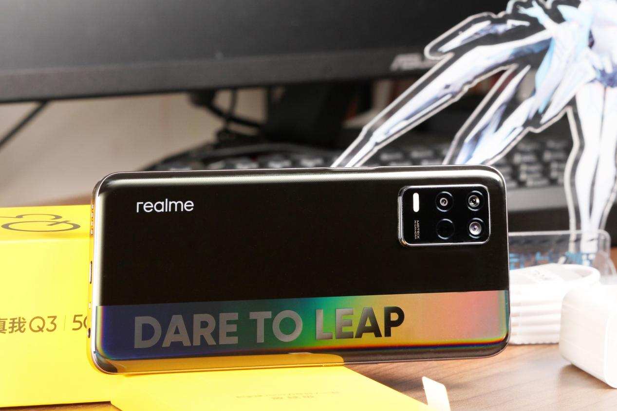 整个机身后背在不同角度的光影之下色彩变幻还是相当丰富的。纵向排布的DARE TO LEAP位置可以从蓝,绿这些冷色调逐渐向黄、粉色这些暖色调过渡,呈现出全息幻彩变化,视觉冲击力强。另外,机身后盖的视觉感通透,手感舒适,低调冷酷深邃就是这款机器的第一感觉;不过,realme 真我Q3的科幻黑与迷幻银这两个版本我比较喜欢后者,不知道大家是否会与我一样的看法。