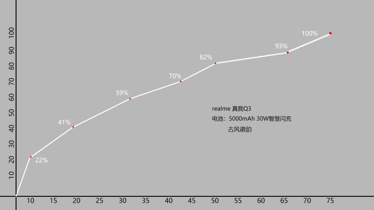 充电方面,30W的闪充是目前千元机中主流搭配,实测充电10分钟可以达到22%,20分钟41%,33分钟59%,43分钟70%,50分钟82%,66分钟93%,75分钟就可以充满!前段时间充电较快,后段时间涓流充电时间相对较长,这样的速度基本是吃一顿饭的时间就可以满足一天的需求了。