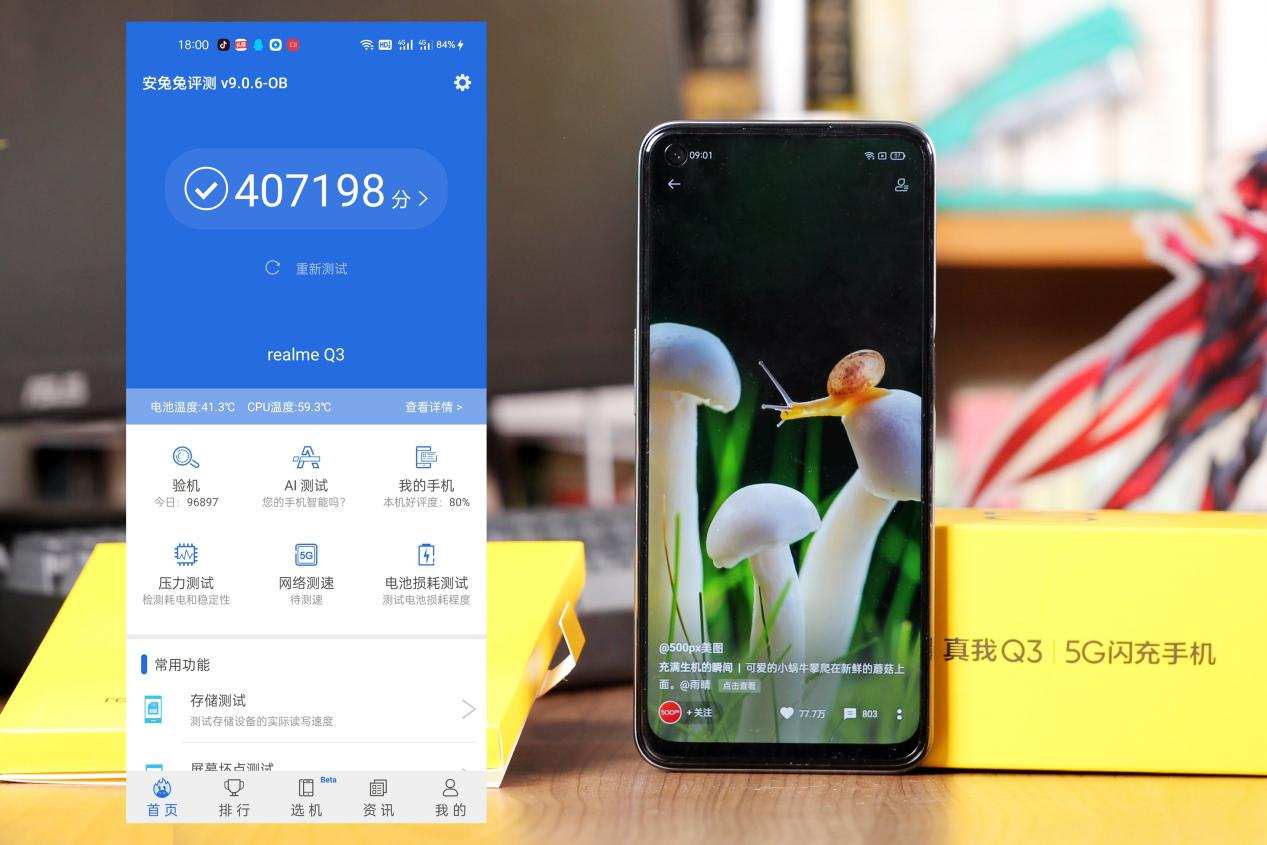 realme 真我Q3搭载的是高通骁龙765G处理器,我这款配备了8G+128G的存储组合,这样的组合在安兔兔的跑分中,得分超过40W+,相当于彼时的高通骁龙855 Plus旗舰机型跑分。