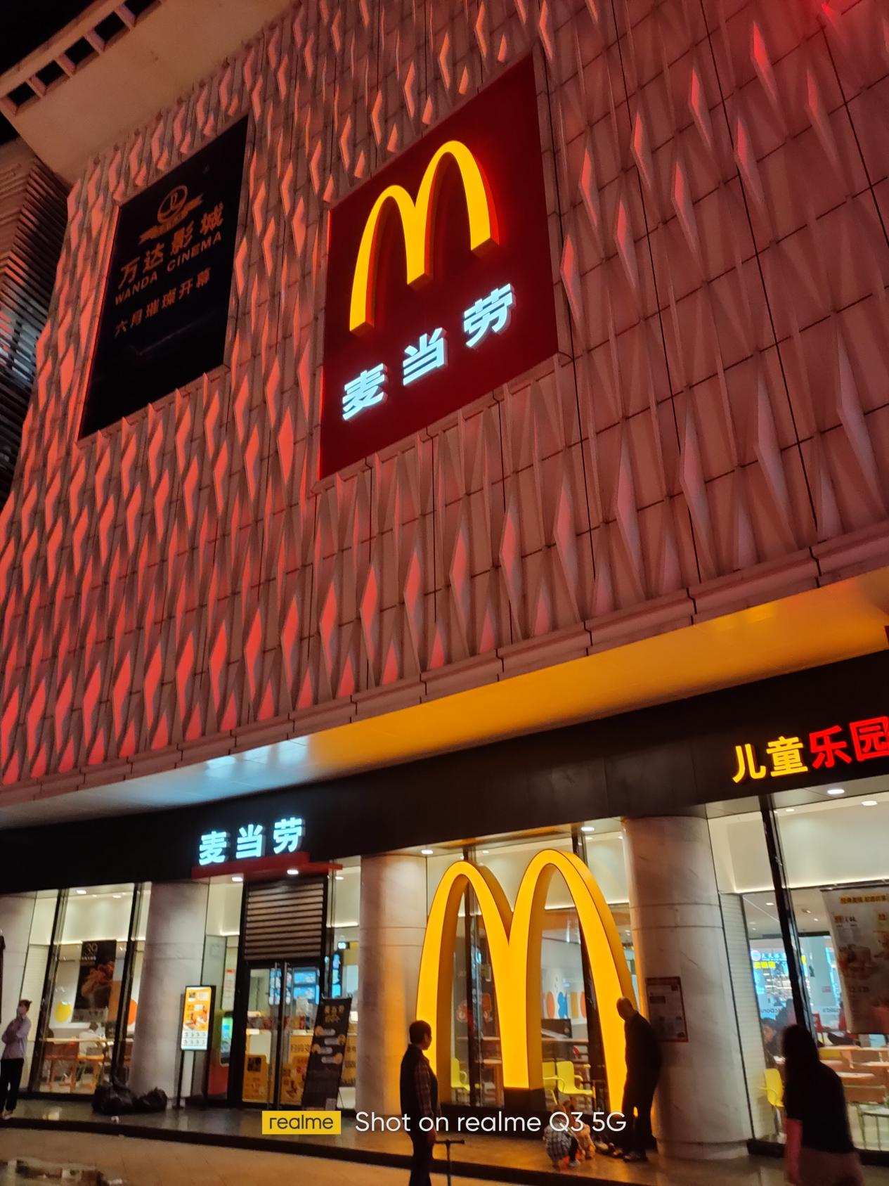 室外夜景我并没有采用夜景模式,同样也是采用标准模式,realme 真我Q3的表现,几个霓虹灯发光字高光压制还是不错的,边缘没有明显的溢出,另外,左上角的万达影像中英文也是清晰可见,画面放大略有噪点,整体夜拍画质表现不错。