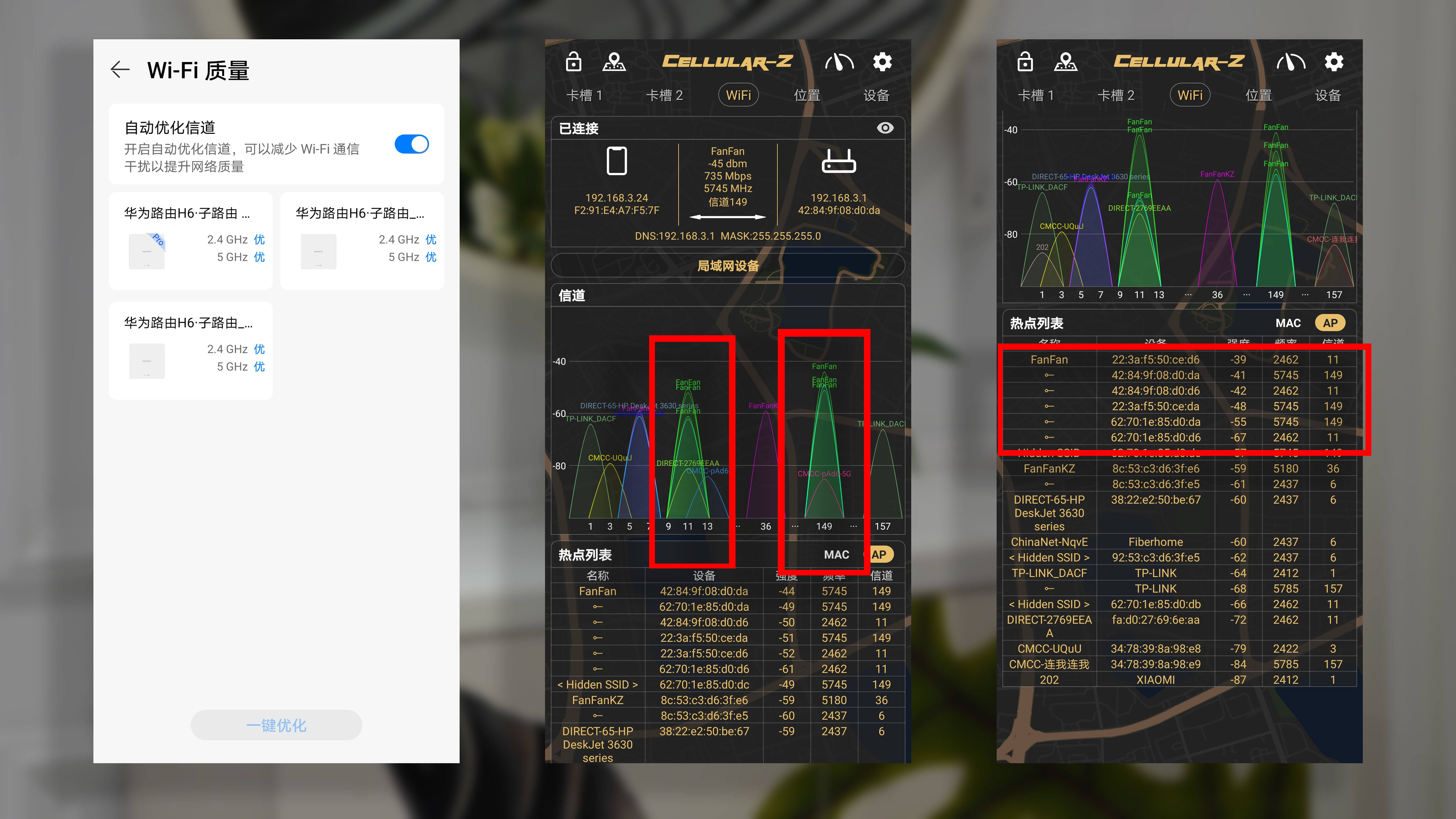 多产品就涉及到子路由器之间的切换,其实从上面的3个测速点,大家可以完全可以放心,因为我们在房间测速,如果还连接着客厅的子路由,网速是不可能达到560Mbps的。同时我们也通过智慧生活APP 查看了一下,确实进入不同屋子,手机会自动连接在网络最好的子路由上面。这是得益于华为路由H6带来华为鸿蒙Mesh+的高效组网,也是首款鸿蒙系统路由器,不再是传统“无线Mesh”从拓扑图的角度,各个路由Wi-Fi名相同,像一个个分布式热点,既能组成一个有机的整体,统一的进行调度,又可以有效继承单路由器上优质的软件特性。除此之外,华为路由H6支持自动信道规划,减少多路由间互相干扰,用CELLULAE-Z 测试了一下,占据的信道都还挺不错的。