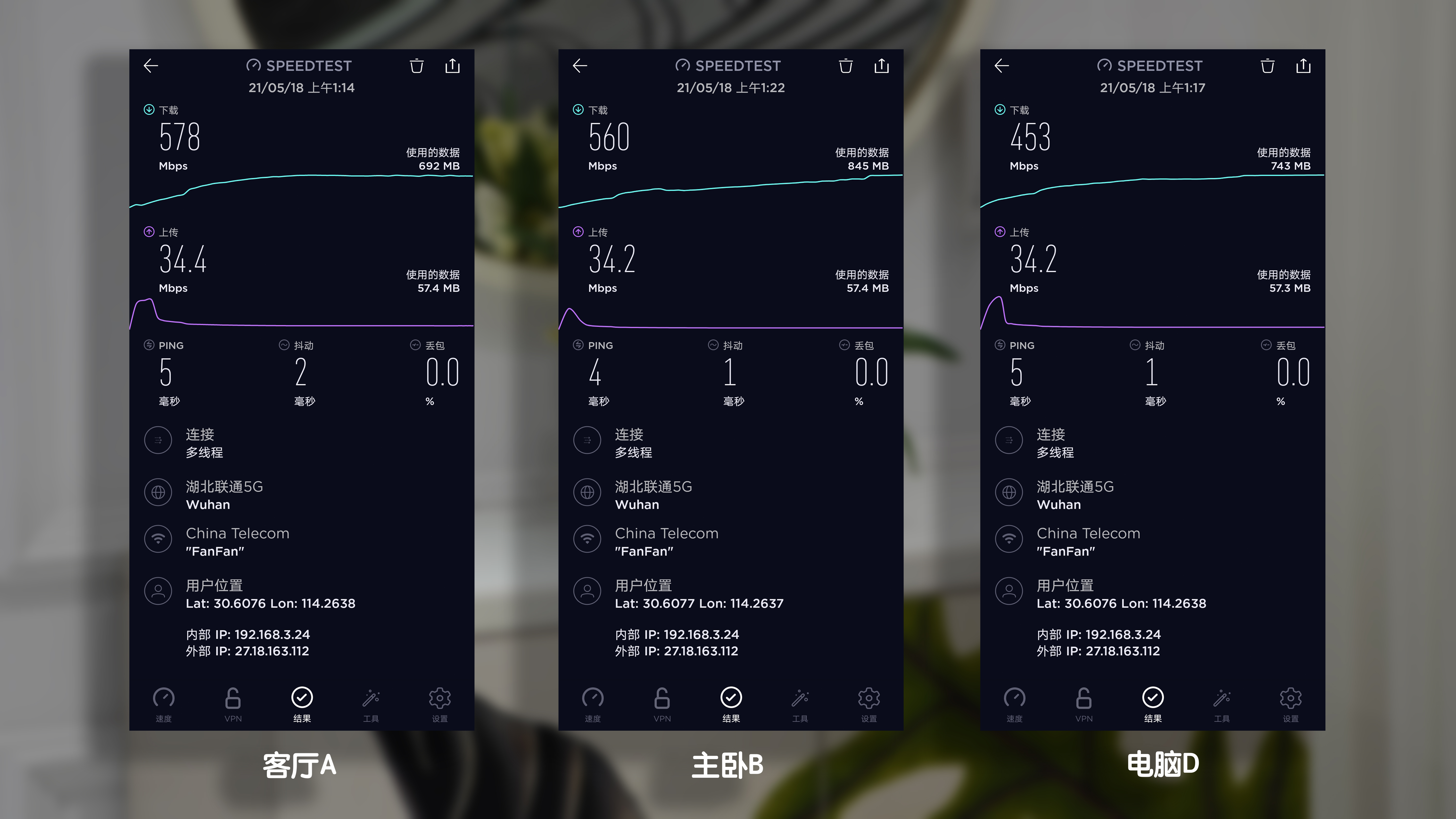 测试之前,我先来说说我们家的房型,房屋面积大概在120平方米,房间并不算“特别大的户型”,但是够“异形”,因为不宽但非常的长。之前路由器位于客厅偏右的位置,主卧最远处的电脑直接是信号死角,即使无线Mesh组网也不是很理想,仅仅是够用,下载东西非常慢。这次我把华为路由H6的三个子路由分别放在了客厅A(子路由Pro版)、主卧B(子路由标准版)和次卧C(子路由标准版),直接用测速软件SPEEDTEST 进行网速测试,客厅的位置手机端的下载速度稳定在578Mbps,主卧A的位置下载速度稳定在560Mbps,而原来网络不好的电脑D位置下载速度稳定在453Mbps左右,500M的网妥妥的得到了最大的利用。全屋可以说都覆盖上网络,而且各个地方的网速都很快,不论是玩游戏还是追剧,再也不会有卡顿了。