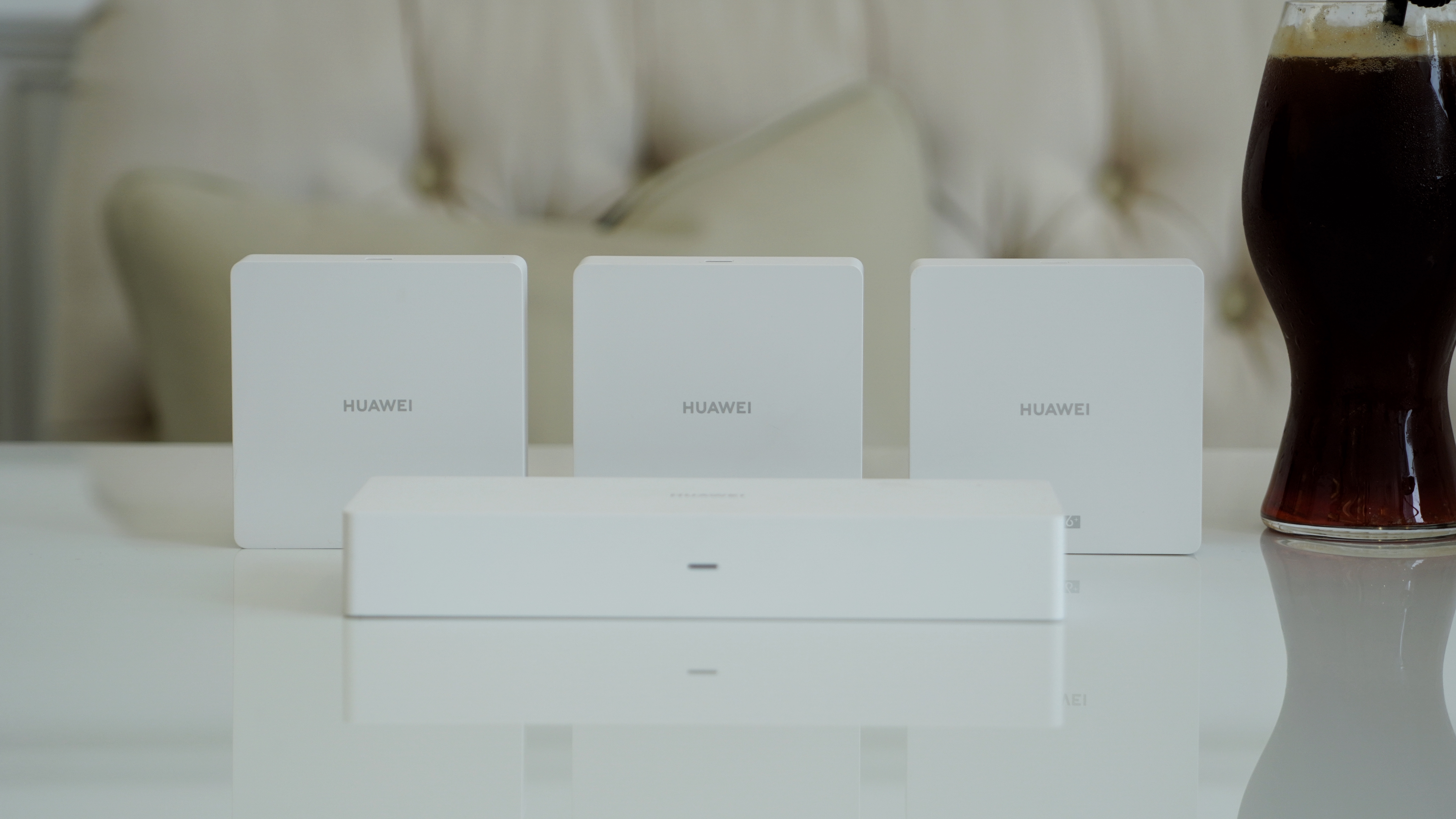 很多大户型路由器 为了更好的穿墙能力和覆盖面积,拥有“夸张”的天线设计,看起来像“八爪鱼”一样。这样不光观感不佳,而且太占空间了,时间久了灰层也不容易清理。开箱后,华为路由H6外观我还是非常吃惊的,两个字概括就是“极简”,华为路由H6采用了子母路由器的设计(分别是:1*母路由、1*子路由Pro版、2*子路由标准版),外观完全看不到天线,全都是小巧、清爽的四四方方白色盒子,说是侘寂之美一点也不为过。
