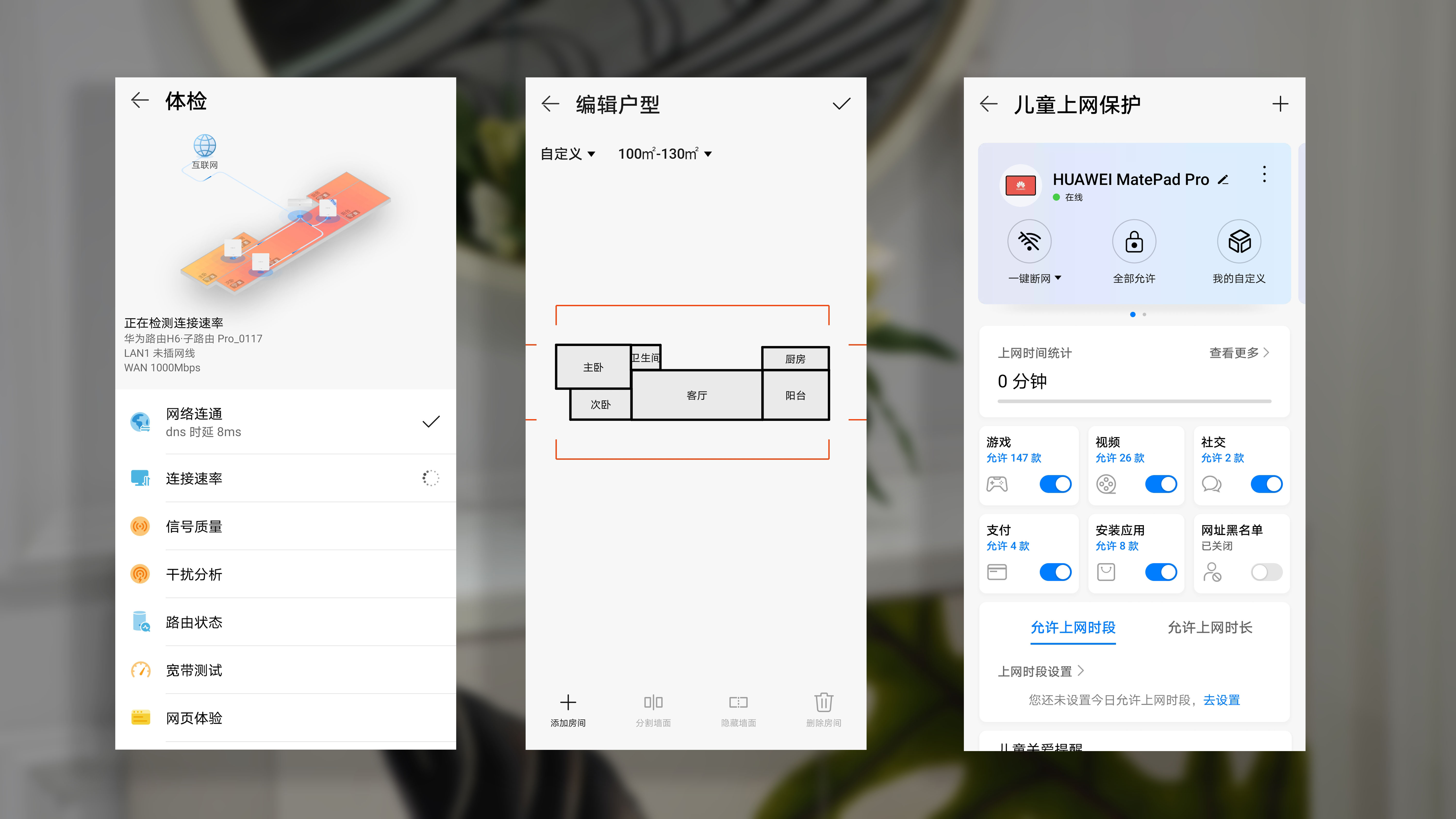 作为国内路由器的先锋,华为路由软件的易用性、扩展以及安全防护功能也是这款路由器主打的卖点。这次华为路由H6的管理APP“智慧生活”最大的变化就是更加可视化了,不仅能够自己绘制户型,可以能看到组网图、热力图,观看起来更加直观。华为路由H6可视化不仅仅局限在户型上面,智能检测、套装管理都进行了可视化风格,让消费者拥有更加沉浸感的体验。华为路由H6的APP功能丰富而实用,去除了花里胡哨的成分,保留下来的都是精华,防止孩子沉迷网络的儿童上网保护功能,帮助游戏玩家的游戏加速功能,针对学生线上的网课加速功能。同时,还具有 HUAWEI HomeSecTM 安全防护,支持 Wi-Fi 防暴力破解、防蹭网、防摄像头劫持。