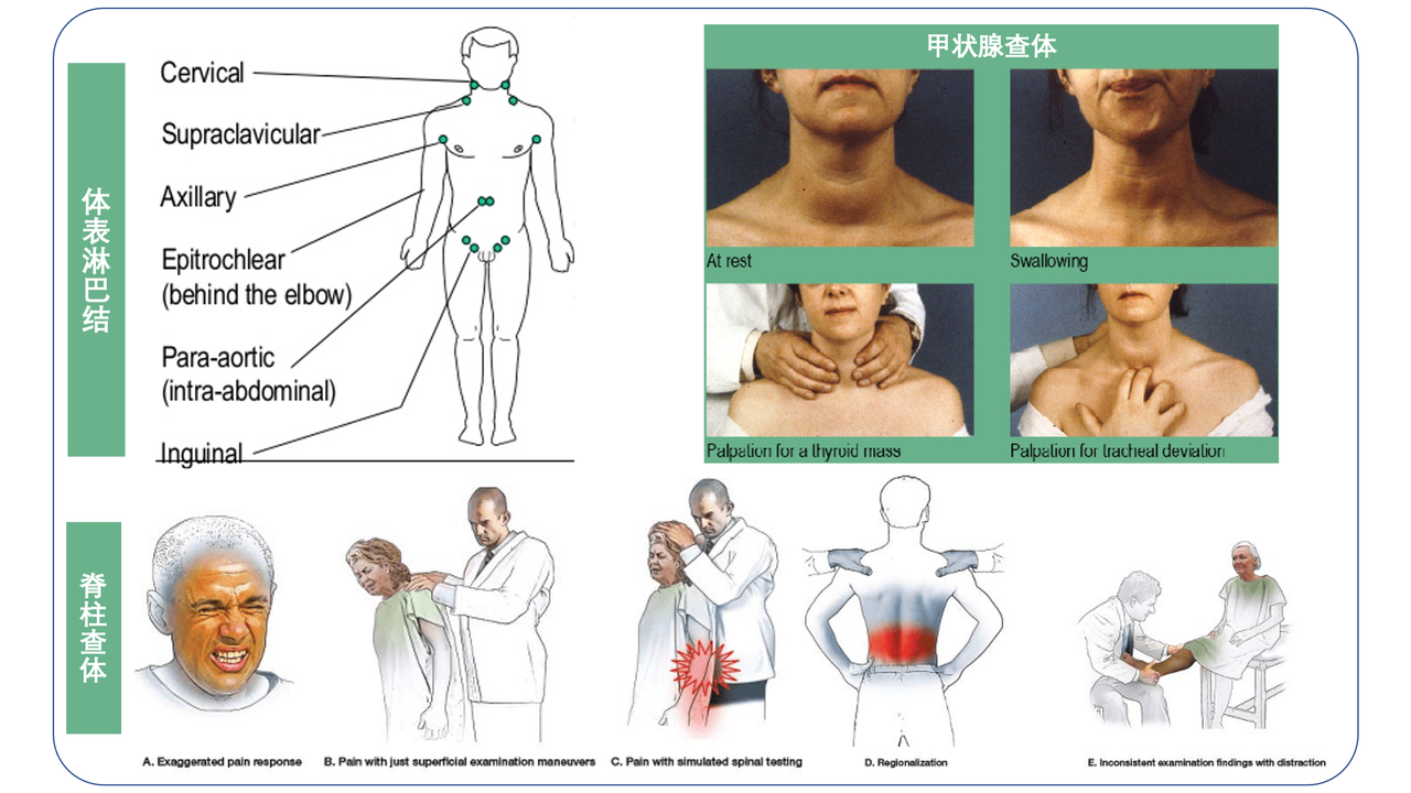 图左上标记了体表可以检查到的淋巴结,包括颈部、锁骨上、腋窝、肱骨内上踝、主动脉旁、腹股沟;图右上是甲状腺查体的方法,需要结合静息状态和吞咽时的状态来观察和触诊;图下方是脊柱查体,就是被医生掰过来压下去的过程。(可以自查的会在自查篇详细讲)
