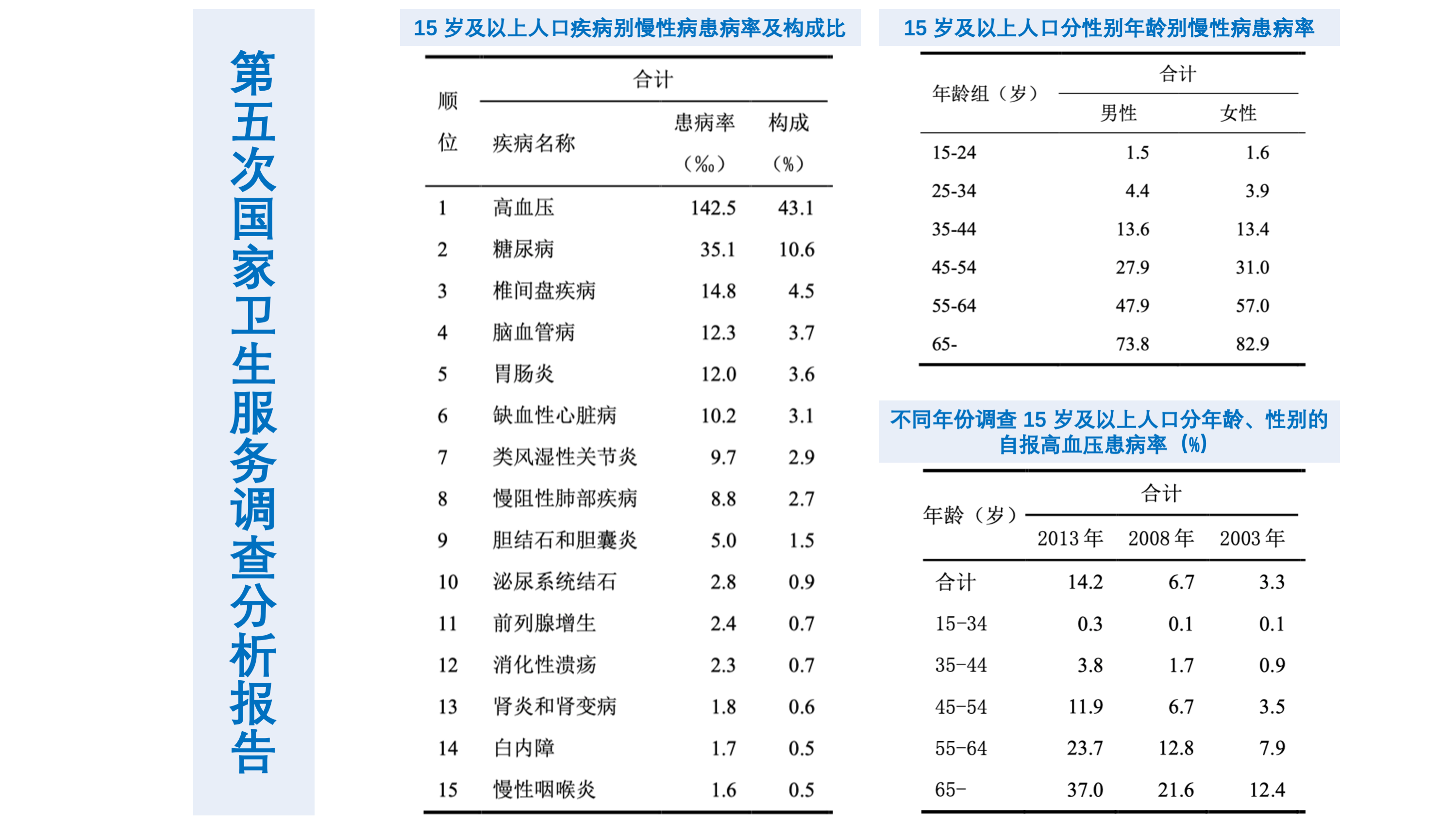 根据 2013 年第五次国家卫生服务调查分析报告,全国 15 岁以上人口患慢性病排名前十的是高血压、糖尿病、椎间盘疾病、脑血管病、胃肠炎、缺血性心脏病、类风湿性关节炎、慢性阻塞性肺病、胆结石和胆囊炎、泌尿系结石。