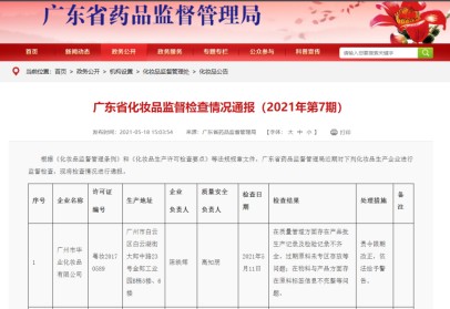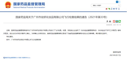 2021年5月18日,国家药监局发布关于广州市妆妍化妆品有限公司飞行检查结果的通告(2021年第33号)。