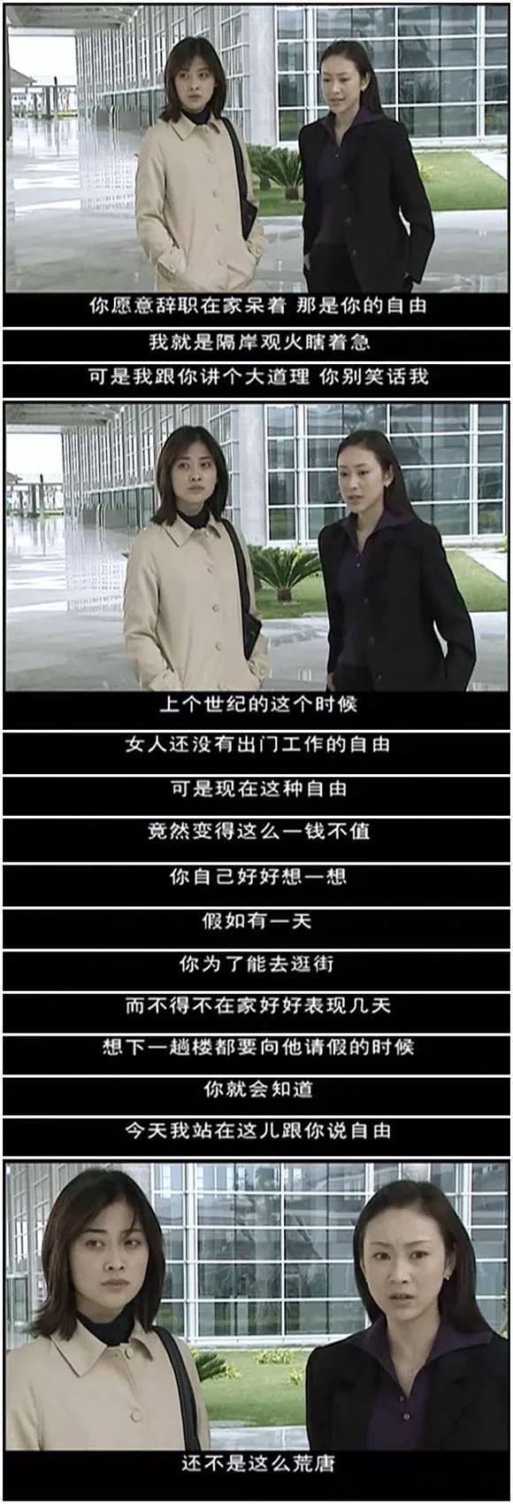 在比如,梅湘南说了这样一段话,“假如有一天,你为了能去逛街,而不得不在家好好表现几天,想下一趟楼都要向他请假的时候,你就会知道,今天我站在这里跟你说自由,还不是这么荒唐”。现实生活中,有多少妻子,不是不惜以辞职为代价,来换取家庭生活的和睦。