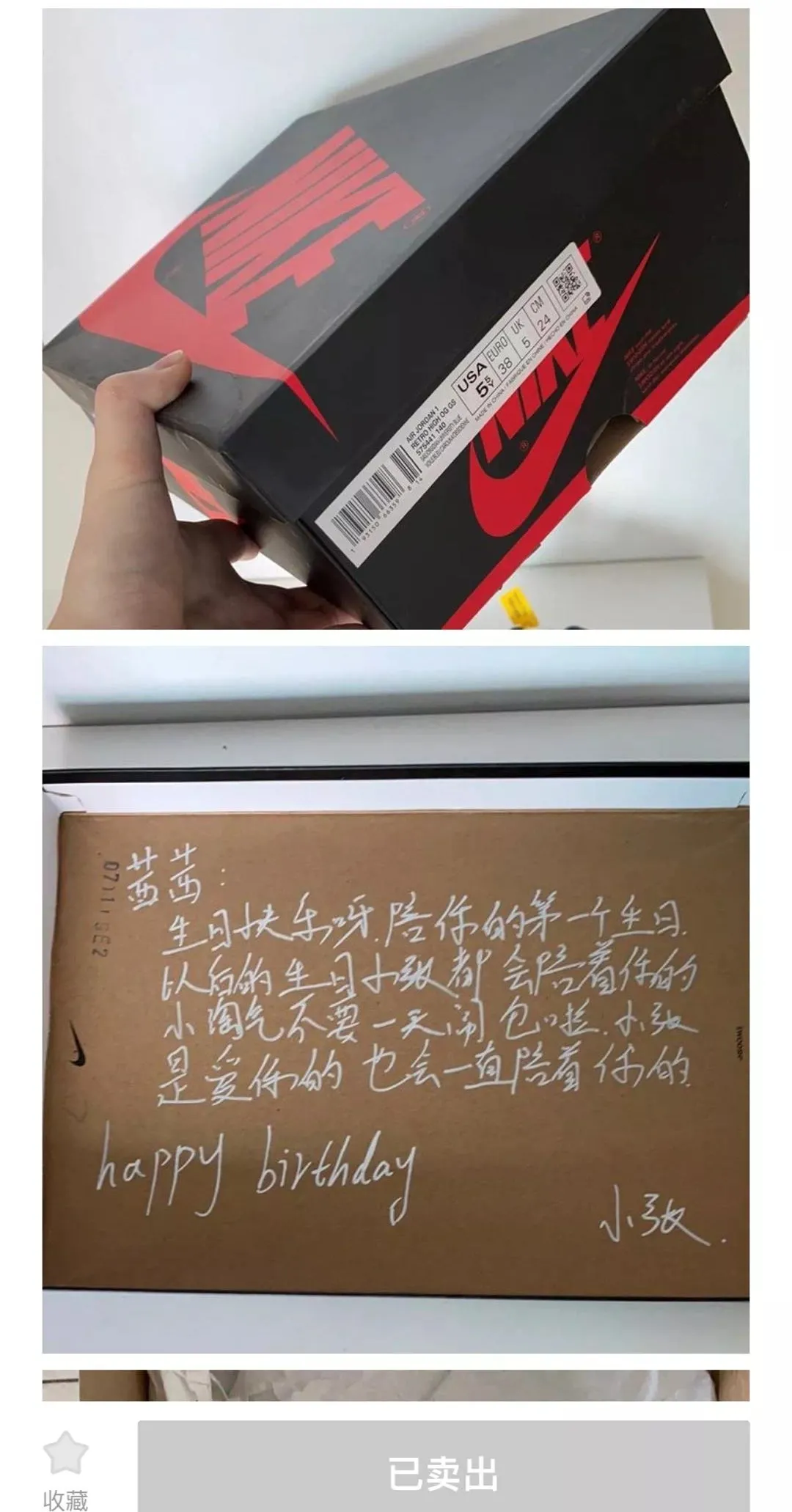 去年有舔狗小张送茜茜AJ1黑曜石,因为鞋盒中写了表白话语而导致二次售卖降价的扎心故事。