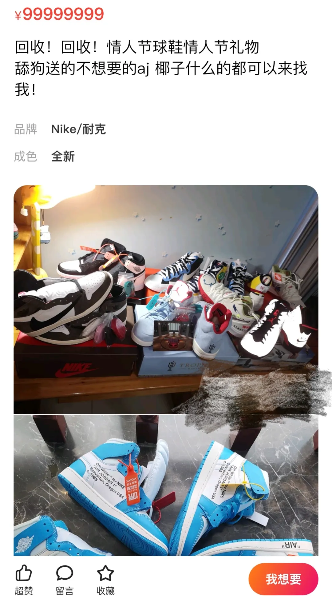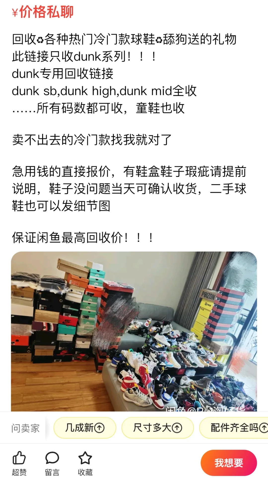 并且某鱼上也形成了针对该标签的先进的产业链,专业收购舔狗送鞋等礼品,不管是AJ、YEEZY还是DUNK,只要是正品都招收不误,声称可以迅速套现!