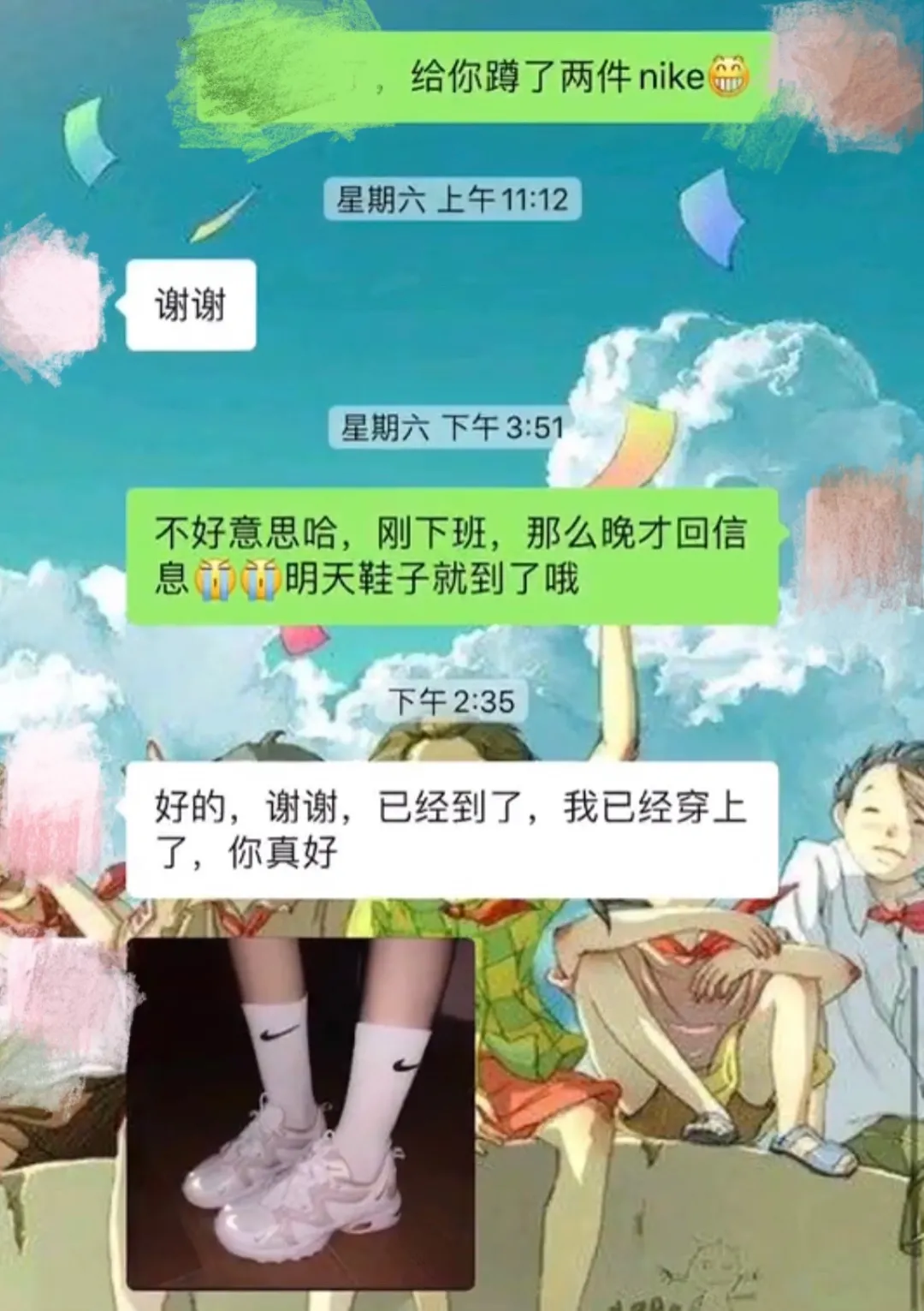 随后便在朋友圈看到了女神以及女神男友的秀恩爱朋友圈,估计作为卑微的舔狗,就算女神有对象,但是看到女神收到鞋后开心的样子,自己心里也会快乐并享受其中吧。