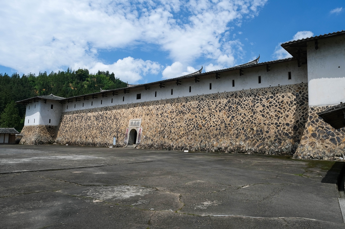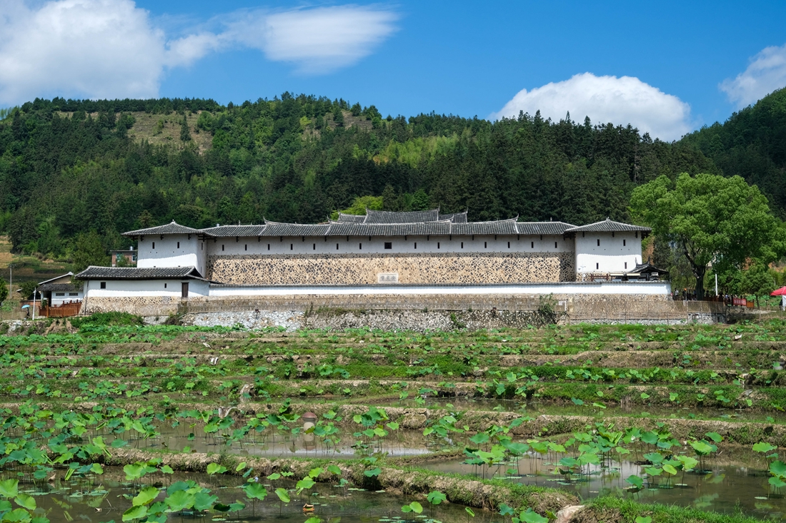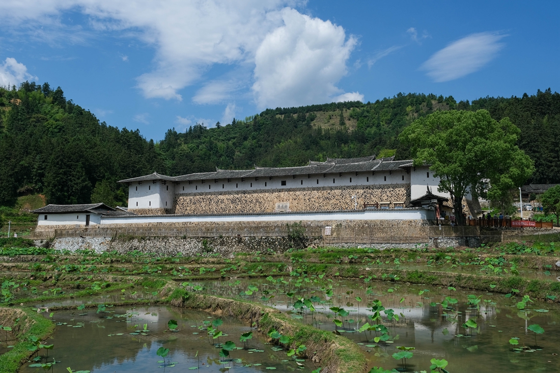 安贞堡位于槐南镇洋头村内,因为建筑体量庞大,正前方是一大片荷田,所以站在村间小道上便遥望可见。在蓝天白云、青山绿叶的衬托之下,安贞堡以遗世独立的姿态在我眼前呈现,它不像一位美人,而像是一位老者,旁边的参天大树就像他手中的蒲扇,在让我心生敬畏的同时,又忍不住地想去与之对话。