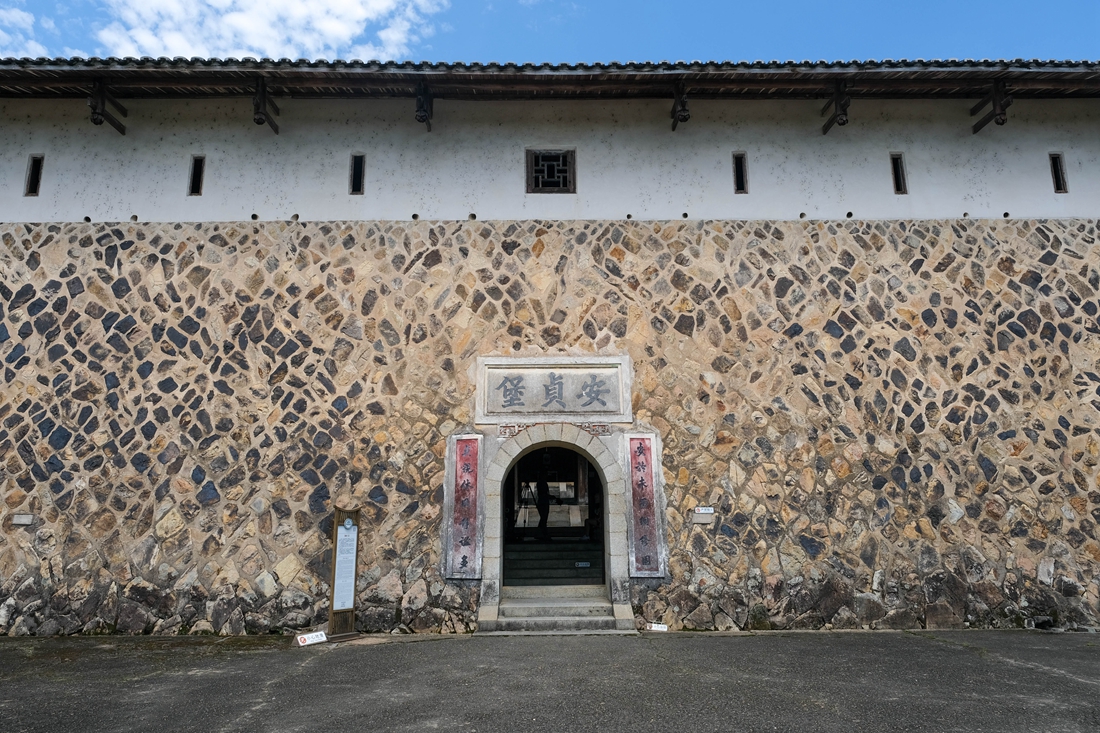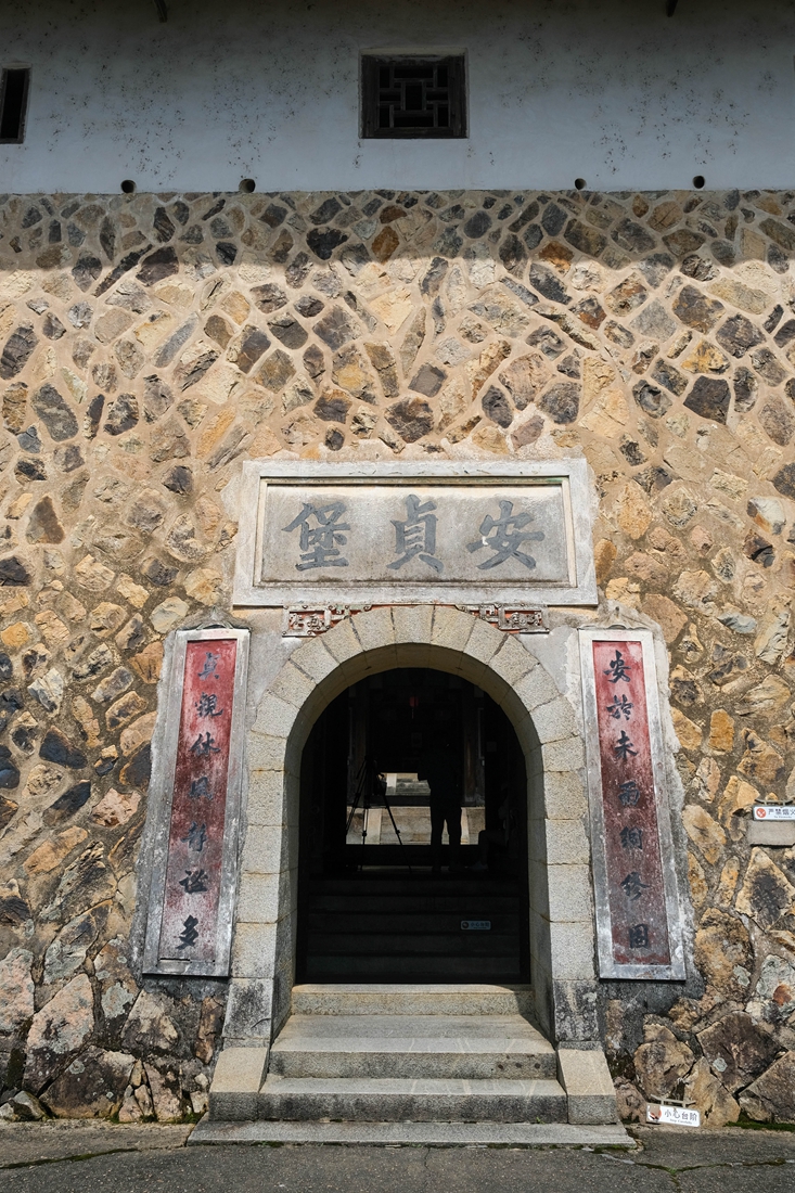 安贞堡的占地面积约15亩,建筑面积6000平方米,如此庞大的建筑却只有一道用巨石砌成丈余高拱形大门用来日常出入。为何只设一道正门?这点并不难理解。在石头大门之上写有"安贞堡"三个大字,是与《周易•坤》中的“安贞之吉,应地元疆”的意思相合。两旁书一对联:安于未雨绸缪固,贞观沐风谧静多。正门前后有两重,前重是两扇六七寸厚的木板门,后重是一道大铁门,正门顶上设有两处灌水孔,用以防范火攻。古人在细节之处总是思虑周全,这点非常值得今人学习。