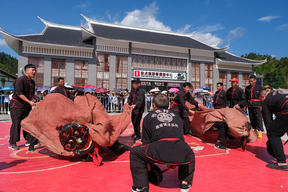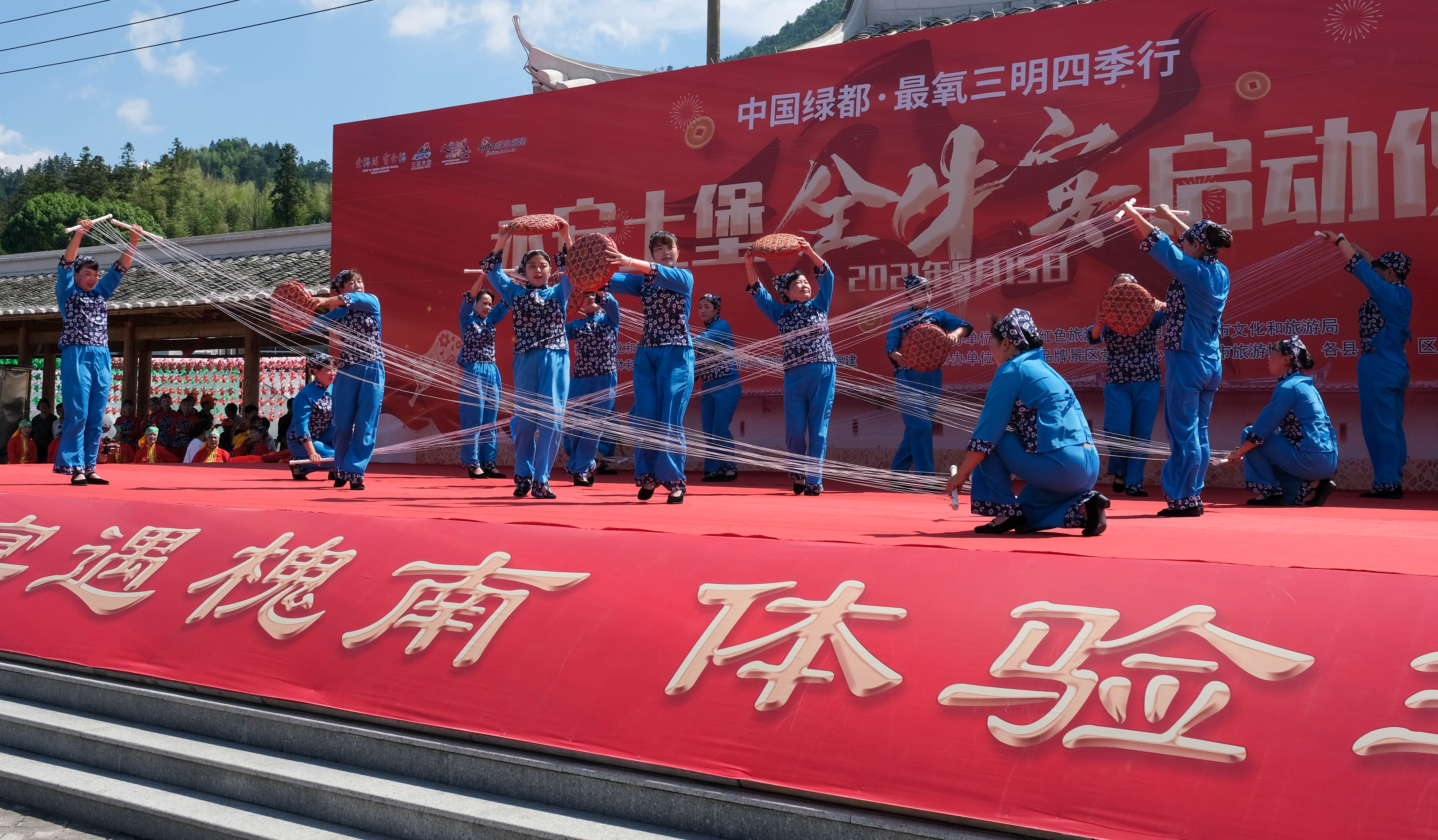 在活动现场,我除了欣赏到甘蔗舞、粉干舞精彩表演外,还看到最具传统特色的打黑狮和安贞旌鼓。打黑狮是一种将傩面舞与南狮表演相混合的民俗活动,是闽中多地区流传已久的年节盛会之一,而安贞旌鼓的历史就更加久远,起源唐宋,最初是作战时的战鼓,如今早已列入第二批省级非物质文化遗产名录,槐南镇也因这项鼓俗先后连续两届被文化部评为中国民间文化艺术之乡。