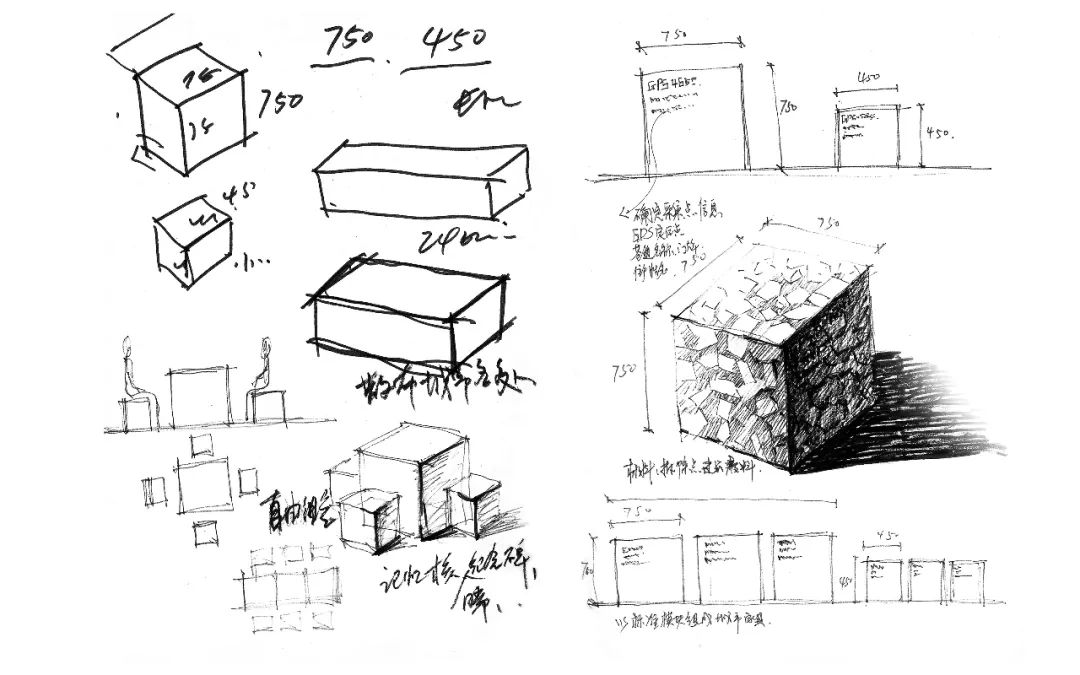这些封存体将会安置在新城的公共空间之中。在未来,对于个人和家庭而言,这些封存体可以作为曾经家园的纪念物。对城市而言,它们还能“用”,可作“城市家具”之用。因为,最初给这些封存体设定了两种尺寸模式:75厘米×75厘米×75厘米,45厘米×45厘米×45厘米,这是正常桌子和椅子的尺寸。这些封存体的组合可以为人提供休憩和使用的功能。