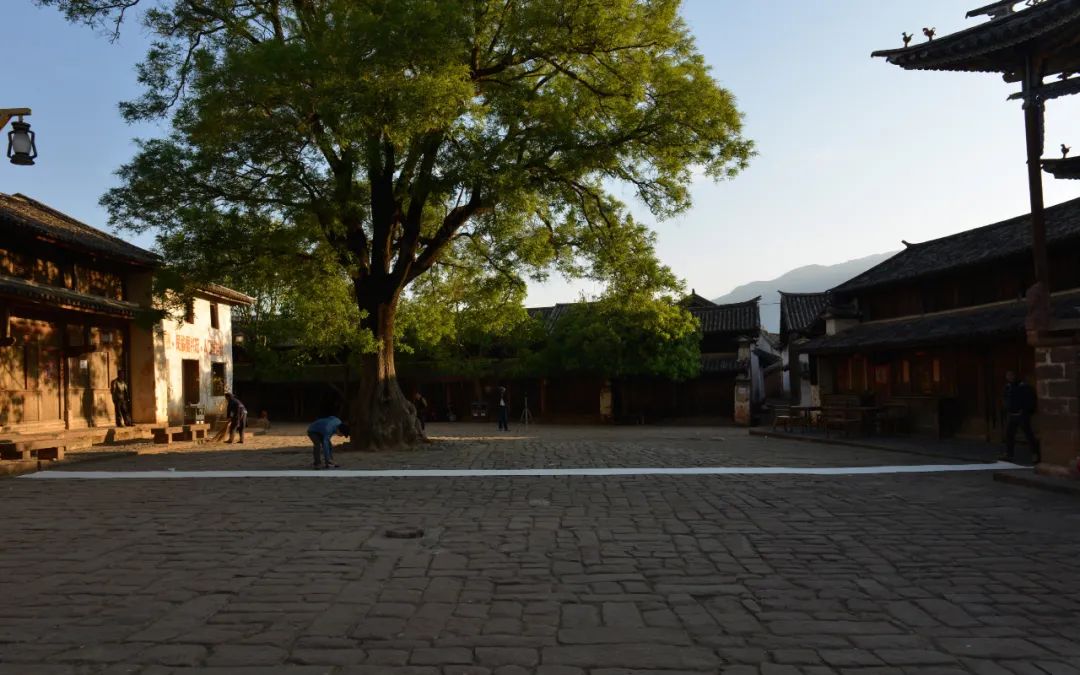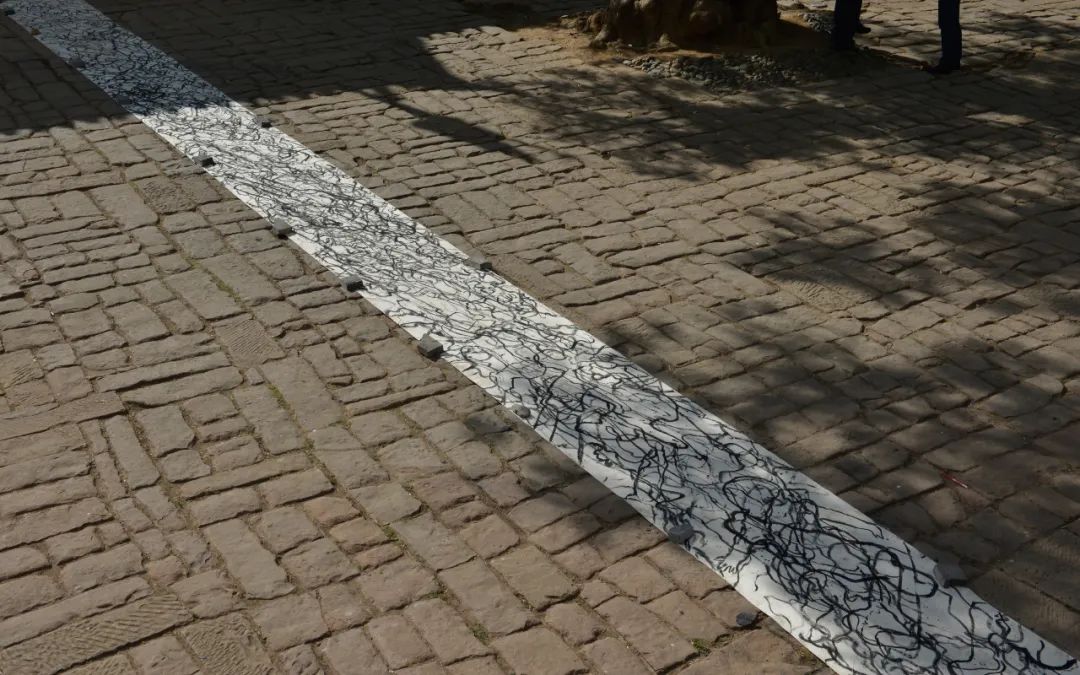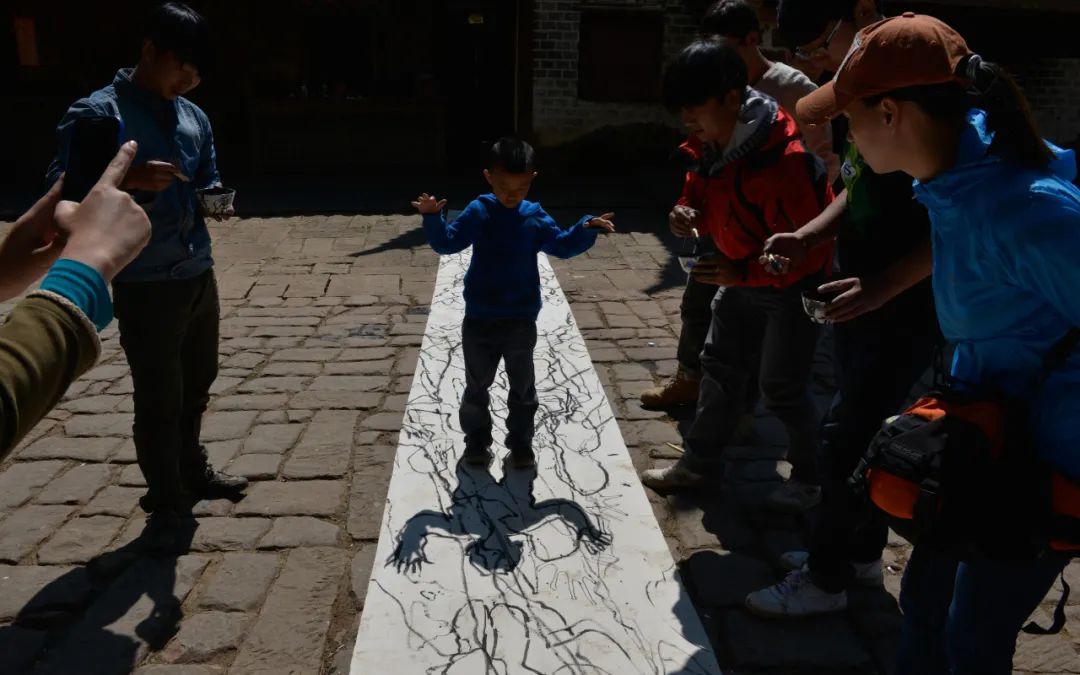 《画影》创作的初衷是希望通过“画影”这一行为对场域进行直接干预,将一天的时间、光影浓缩在一块17米长0.9米宽的亚麻布上。我们用亚麻布将沙溪古镇古四方街从中拦截,这里是古镇游览的必经之路,所有经过这个区域的人必会在布上留下印迹,同时,一天太阳的东升西落也会将建筑和树木的阴影投射在画布上,我们所做的是将这些落在画布上的影子画下来,规则是:过路的游客、居民只要愿意我们都可以将他们的影子画下,如果不愿意,留下足迹也行。我们每隔一小时在麻布上画一次建筑、树影。